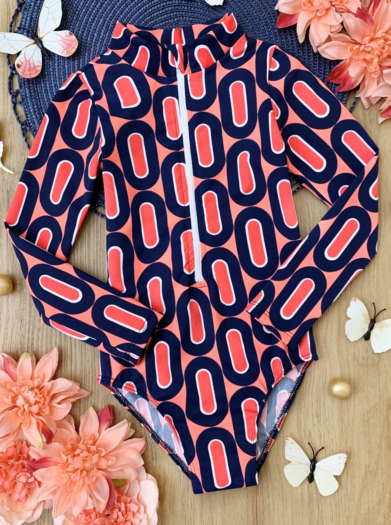 - This long-sleeved one-piece rash guard swimsuit has a front zipper and a retro geometrical oval pattern