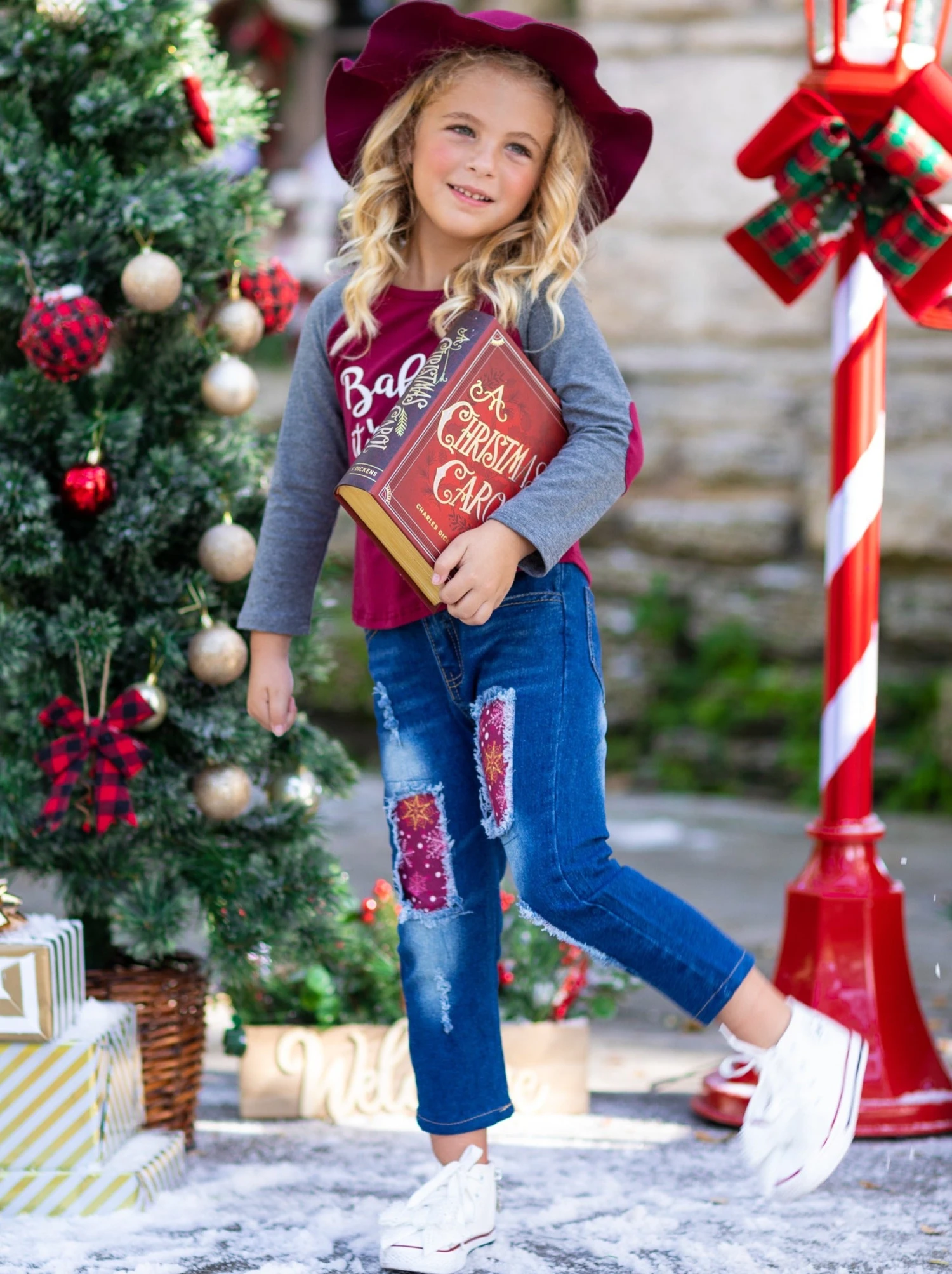 - This precious raglan top and ripped jeans set will definitely get your little snowflake winter-ready! She’ll stay warm and trendy wrapped in long sleeves with patch elbows and super soft, distressed jeans with snowflake fabric peeking through.