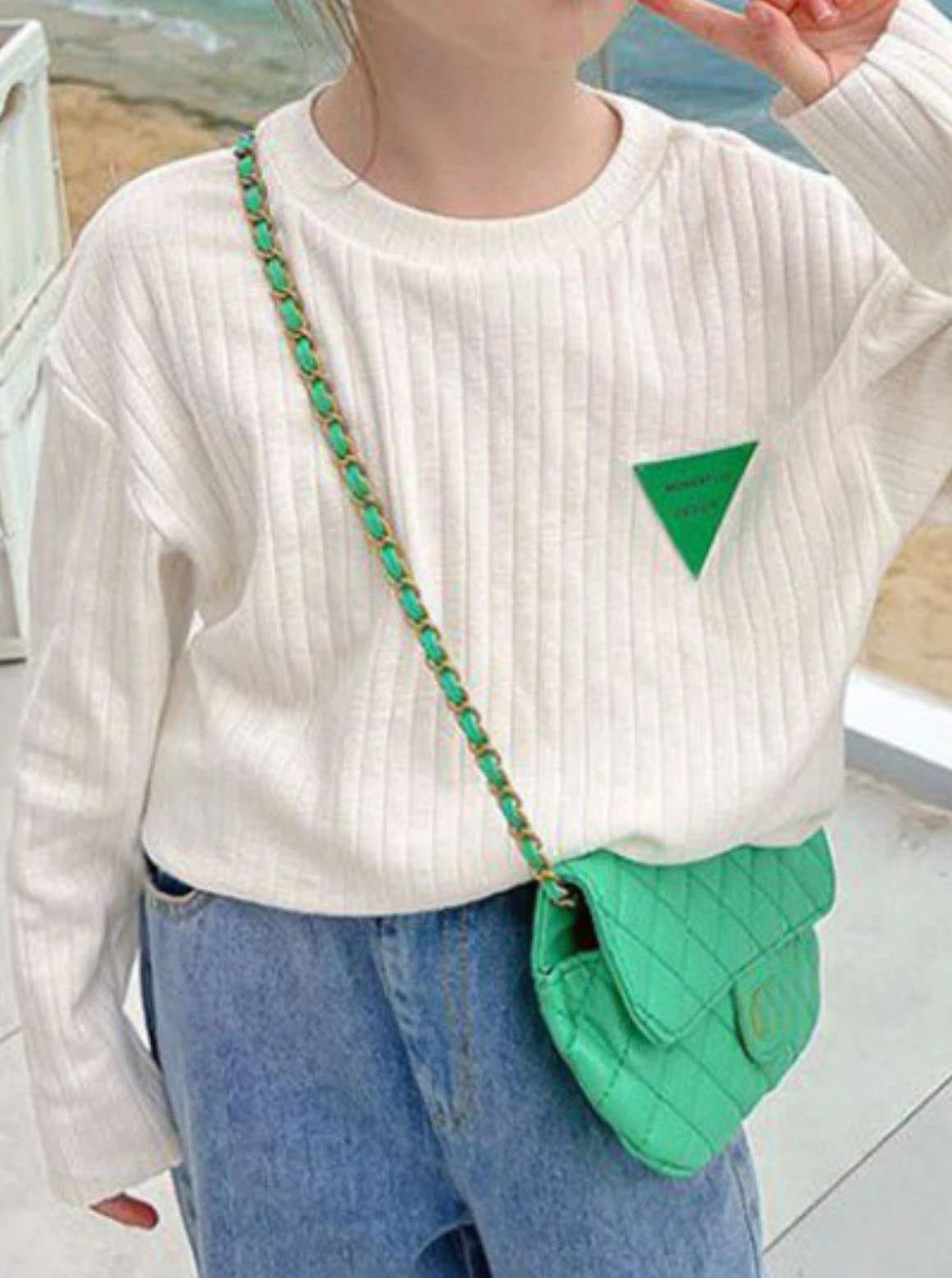 - Basics are not boring! Your little girl will love this ribbed long-sleeve top. It’s simple but chic, with a comfy round-neck style, and decorated with trendy green logo detail, for a subtle pop of color.Â
