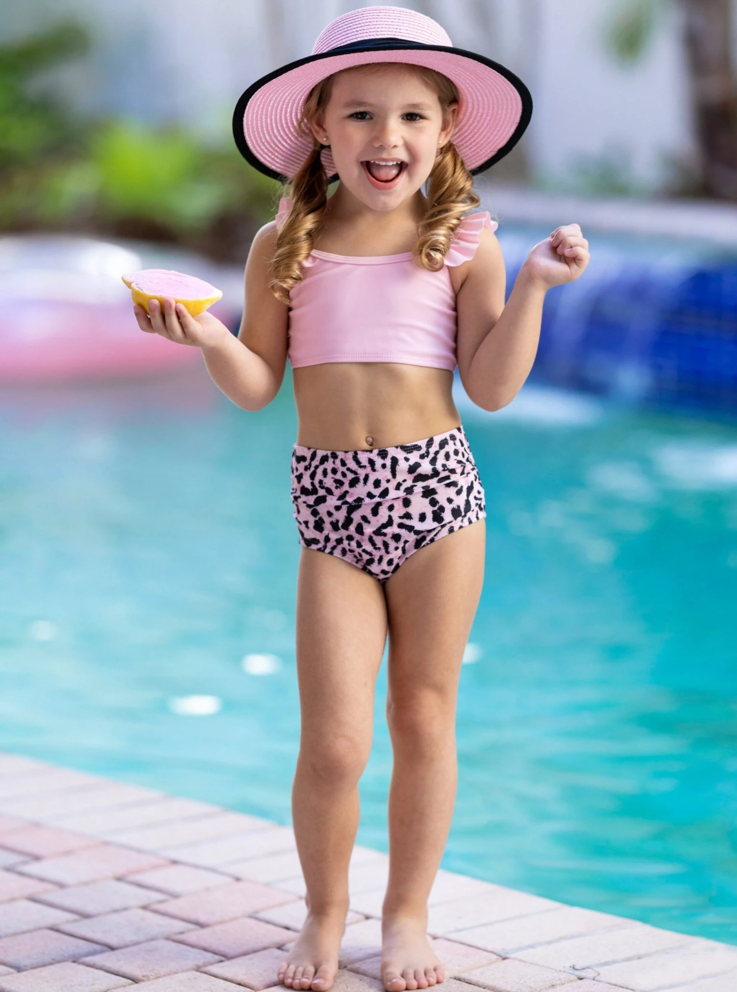- Two-piece swimsuit features a pink tankini top with ruffled shoulders and a cheetah print swimsuit bottom