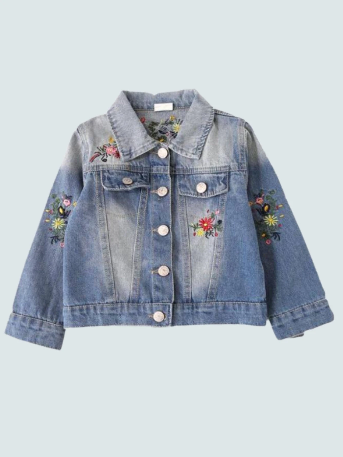 - Denim buttoned jacket with floral embroidery