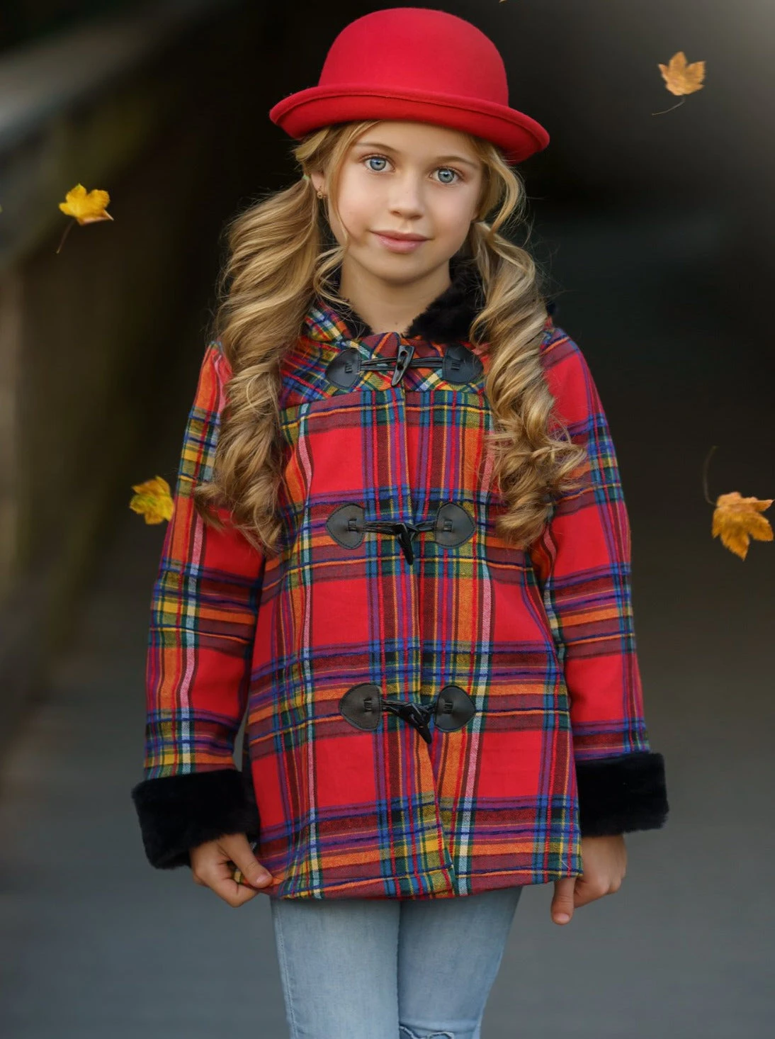 - Calling all fashionistas! Your new favorite winter hoodie has arrived! Made from Royal Stewart tartan, this kids’ coat features faux black fur trim on the collar and sleeve cuffs and has classic black toggle buttons along the front.Â