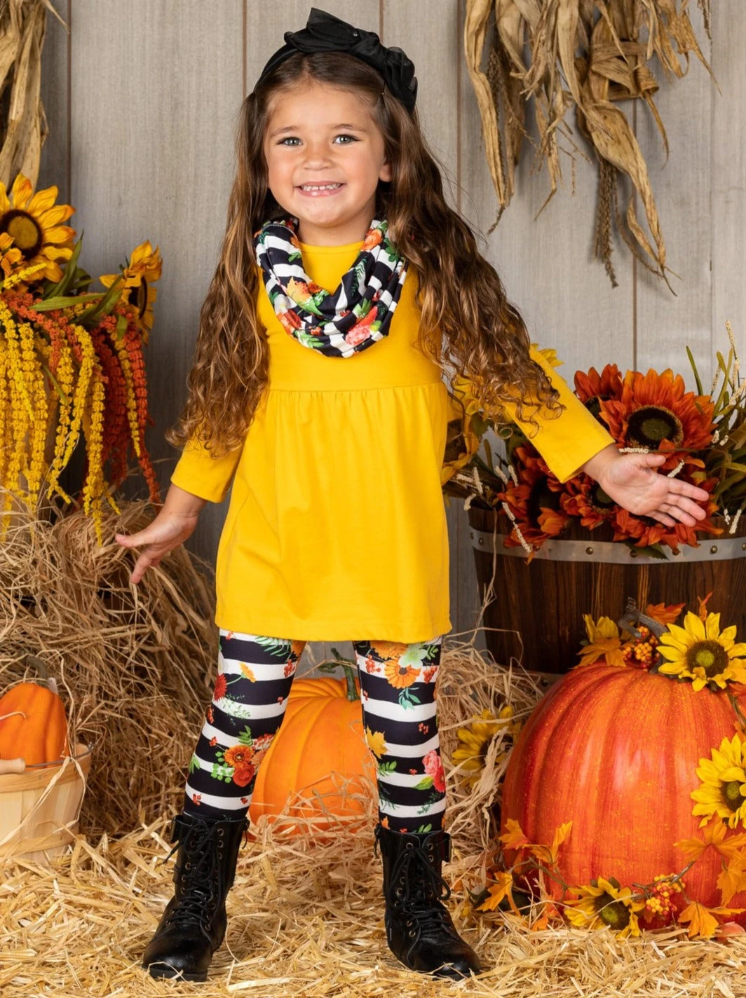 - A cute floral legging set is awesome, but one WITH a matching scarf is simply a must-have for every little girl. The chic stripes only make it better. Make sure you grab yours today!