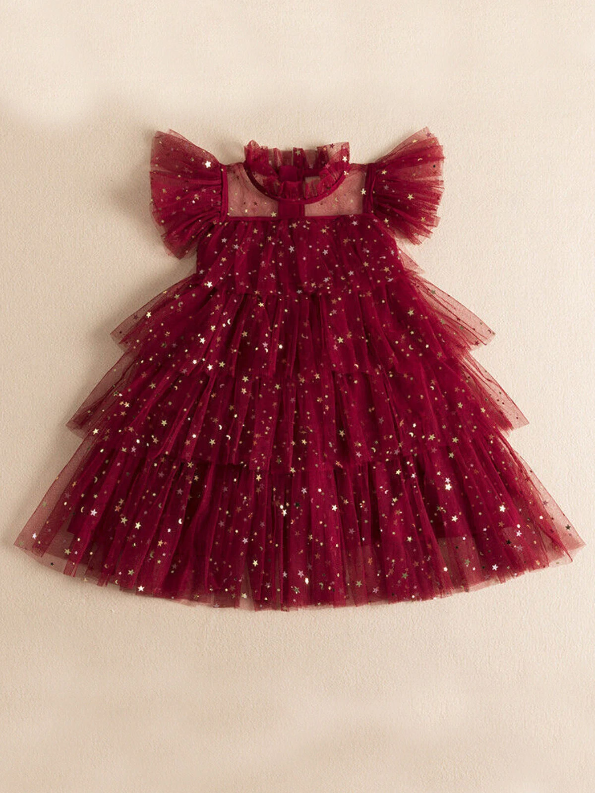 - Red layered tulle dress with sheer neckline, flutter sleeves, and star sequin embellishments