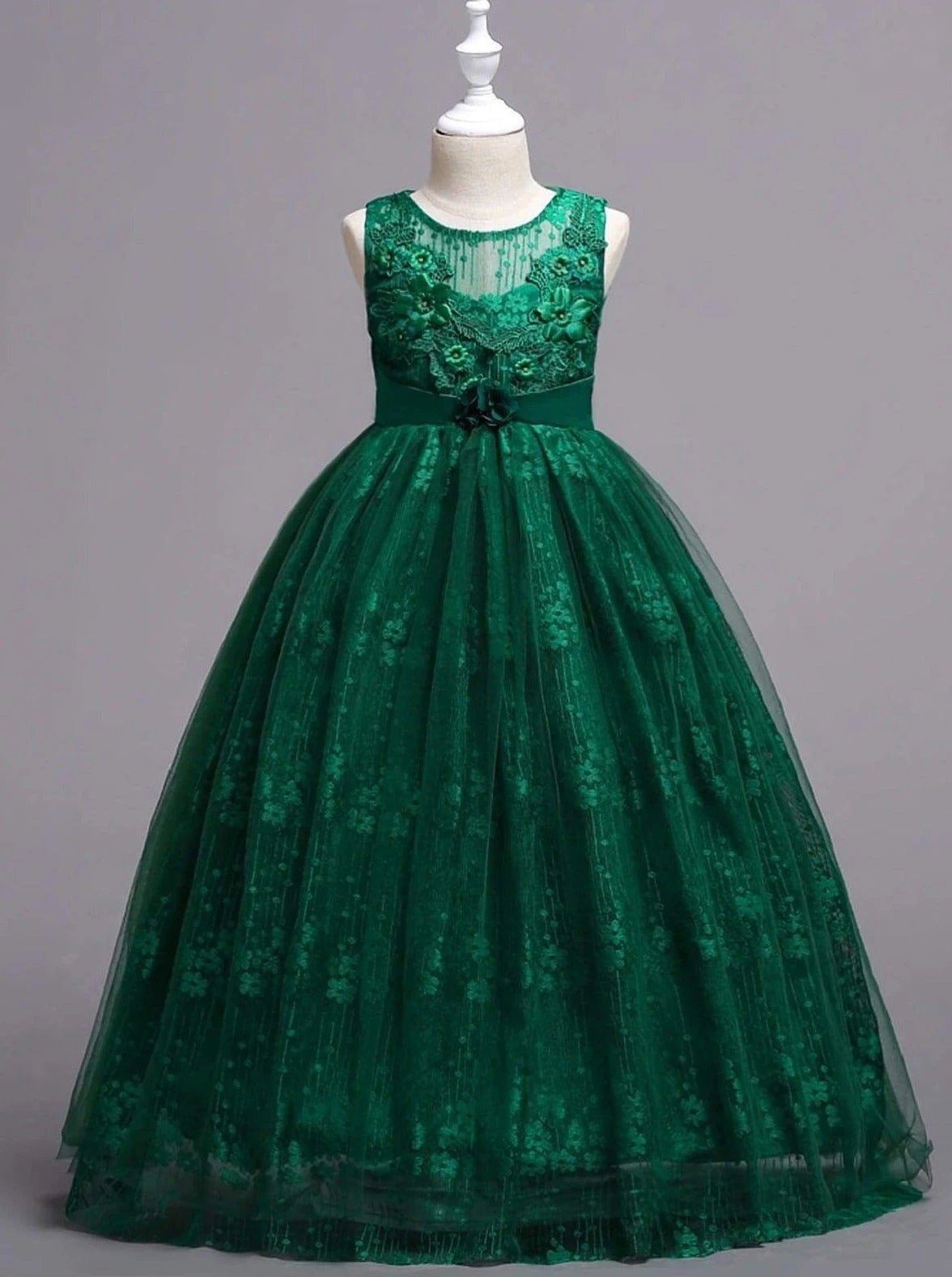- This luxurious dress has gorgeous appliques and tiny rhinestones sewn onto each flower. The full-length lace skirt is perfect for twirling in. She’s sure to dazzle and delight she flaunts her grace and style in a special occasion gown she’ll want to wear again and again.