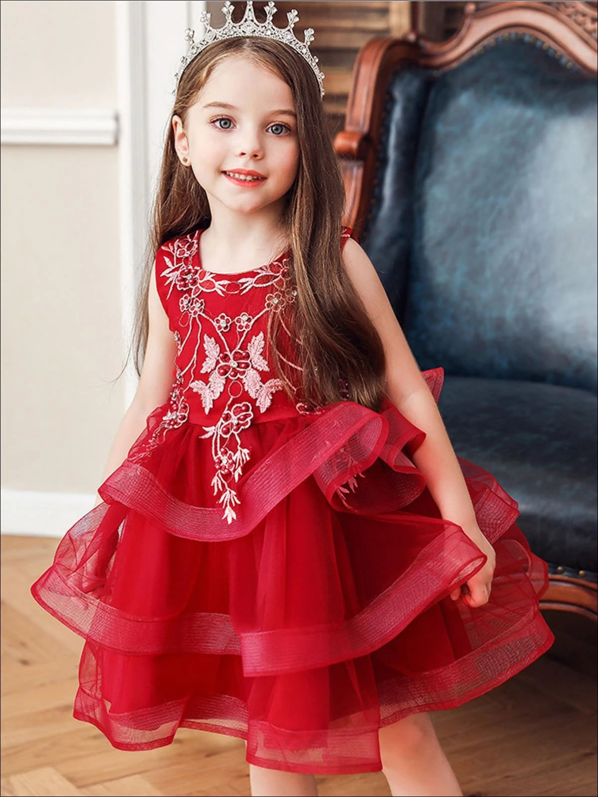 - Sleeveless princess dress with embroidered bodice and tiered tulle ruffle skirt with satin underlay