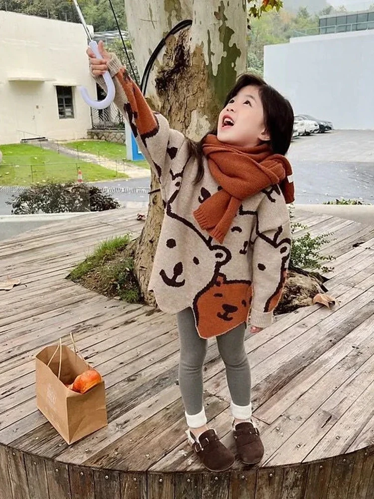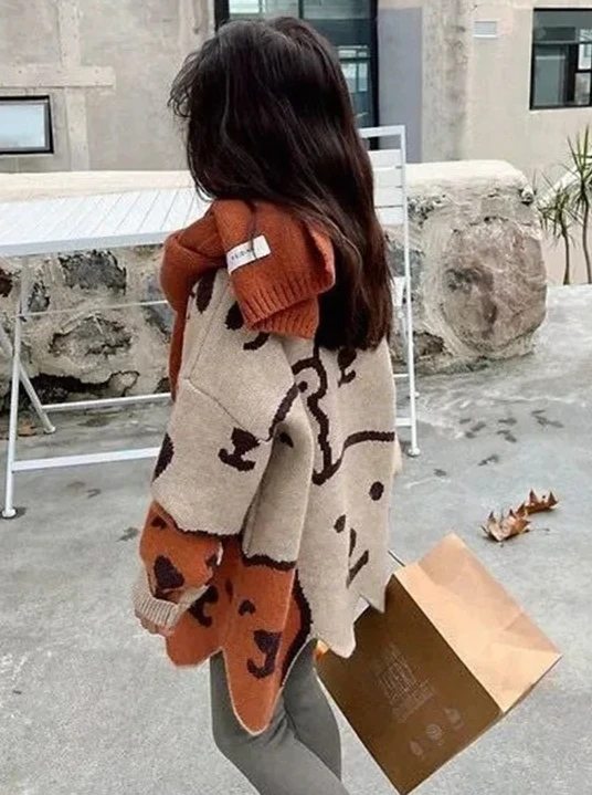 - When the weather gets chilly, our bear print oversized sweater can give extra comfort, like a warm hug on a cold day. Styled with an adorable and eye-catching bear print, this cozy sweater is guaranteed to get extra likes on the ‘Gram while keeping your girl comfy all day long.Â