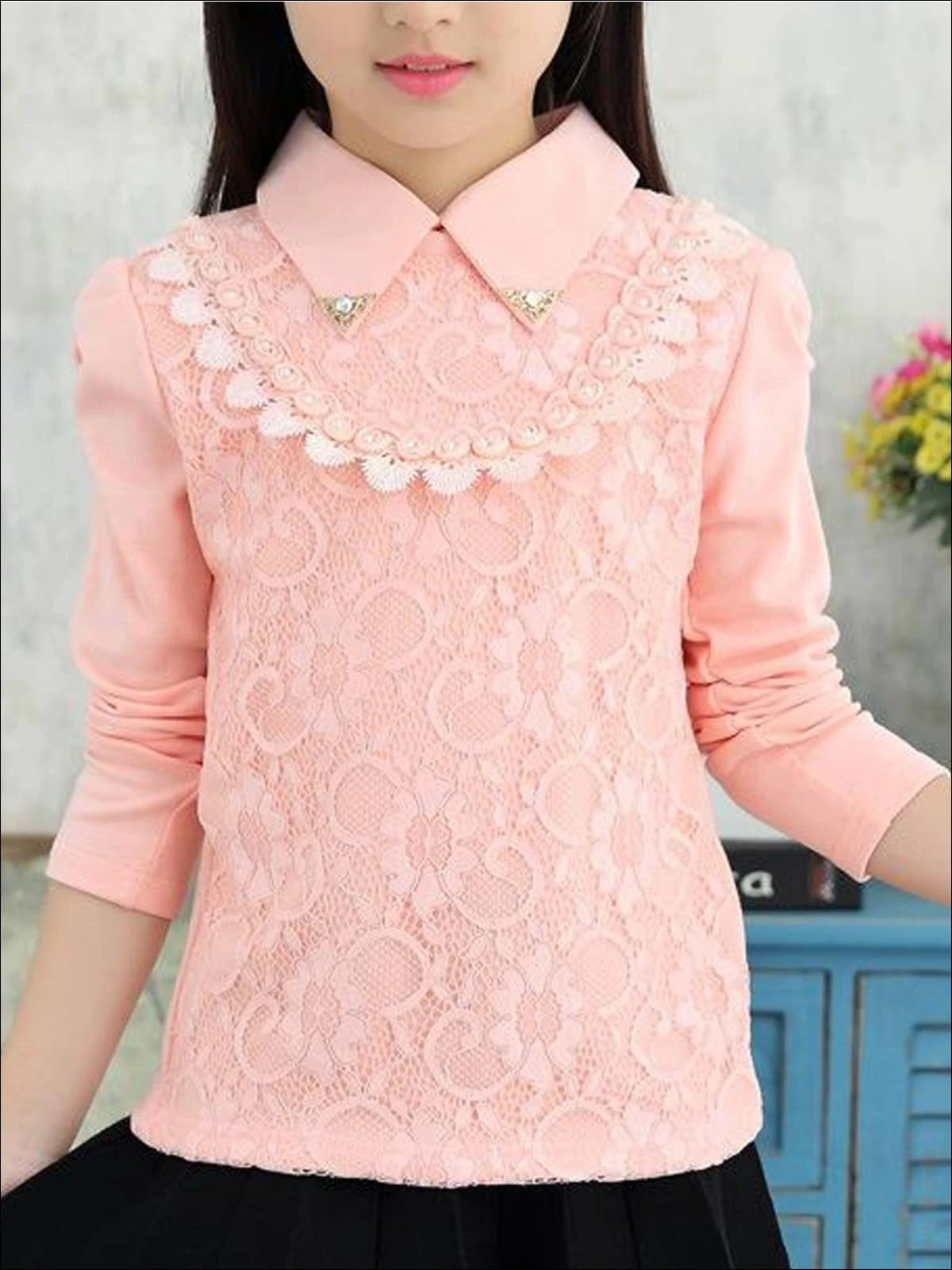 Go back to school in style with this elegant lace top with flat collar and puff sleeves. Available in Pink and White.