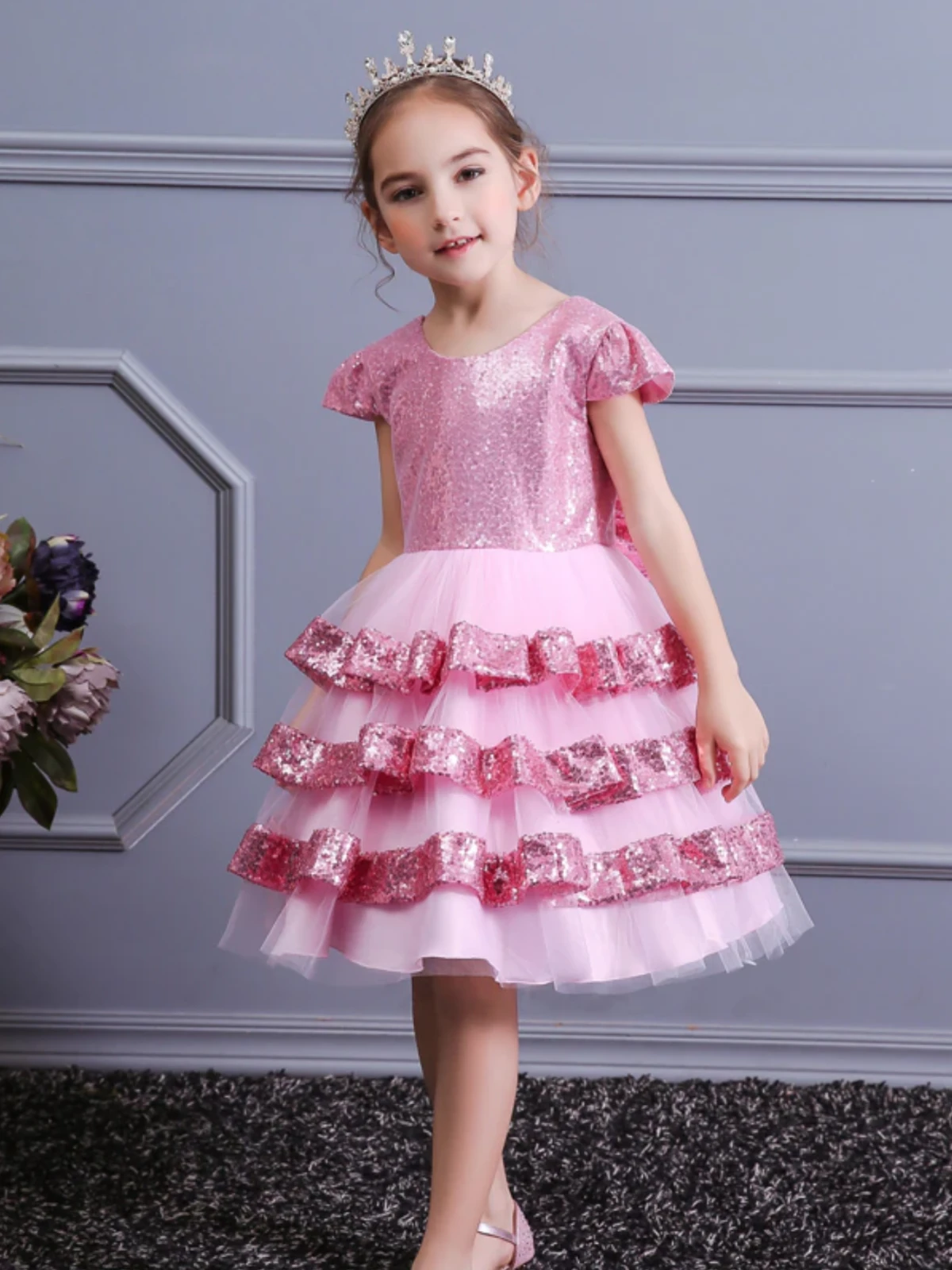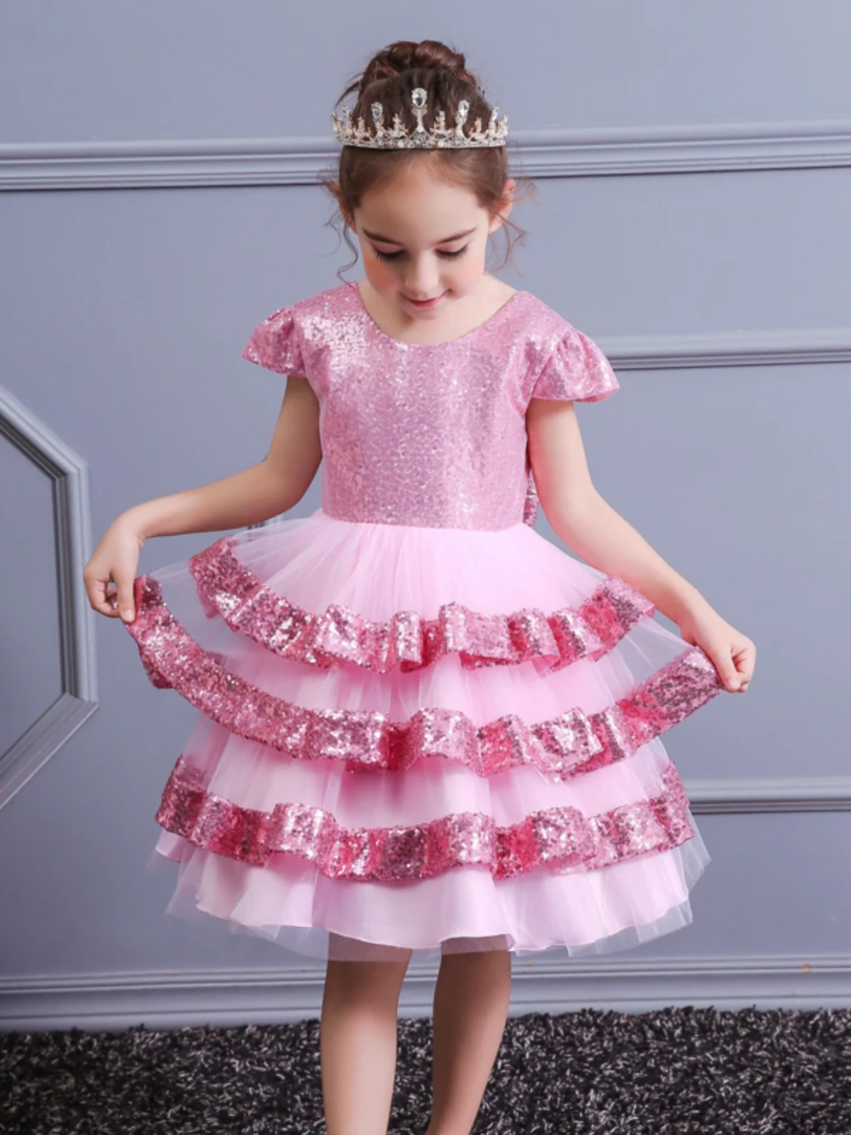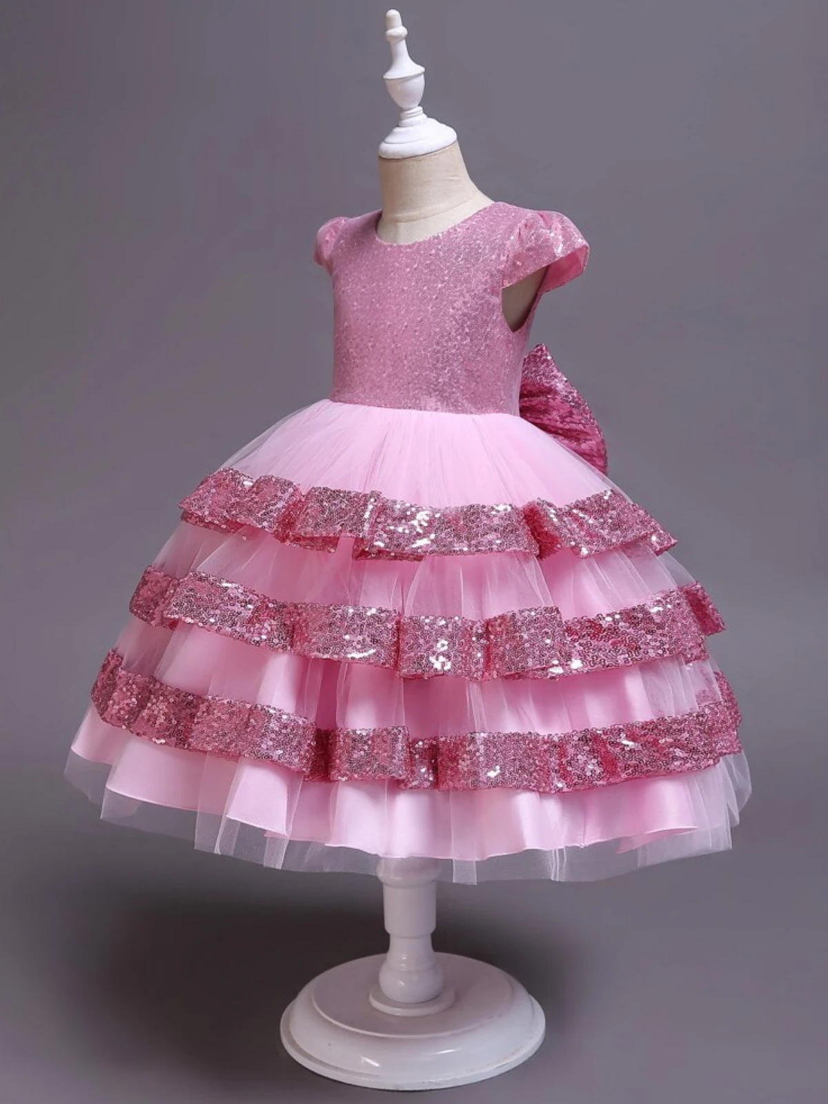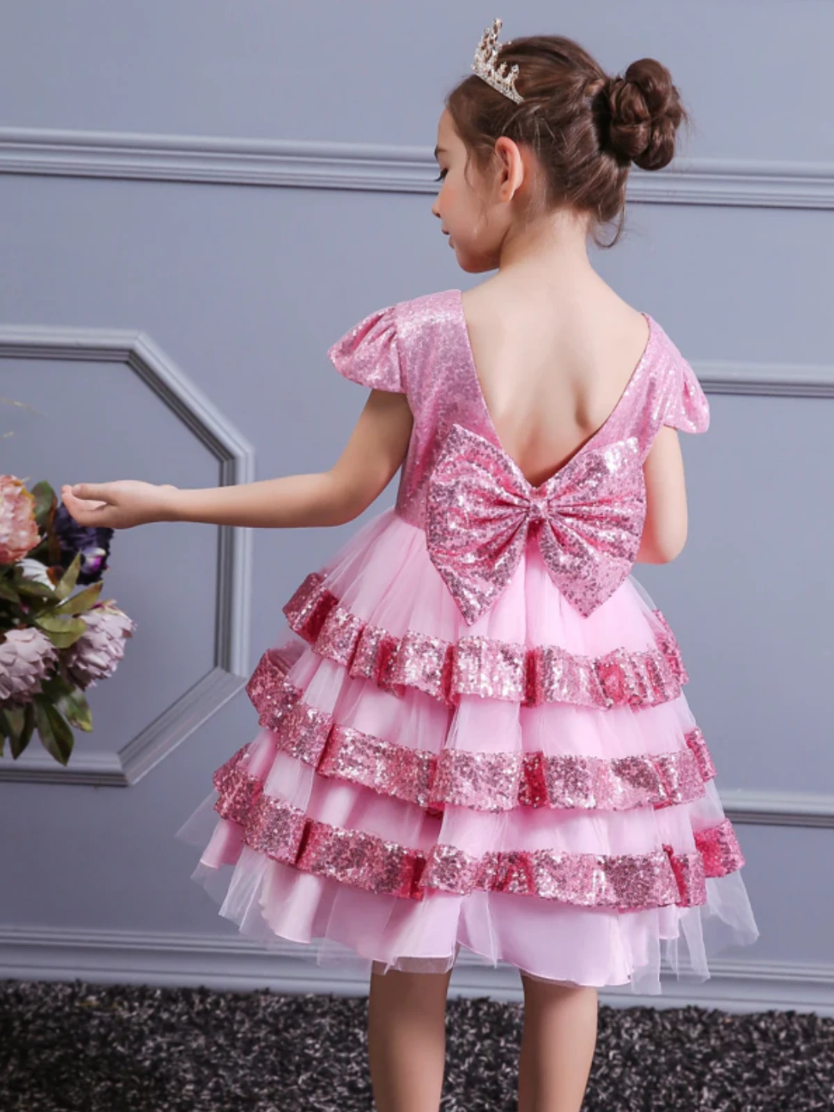 - Pink sequin backless dress with layered skirt and statement bow