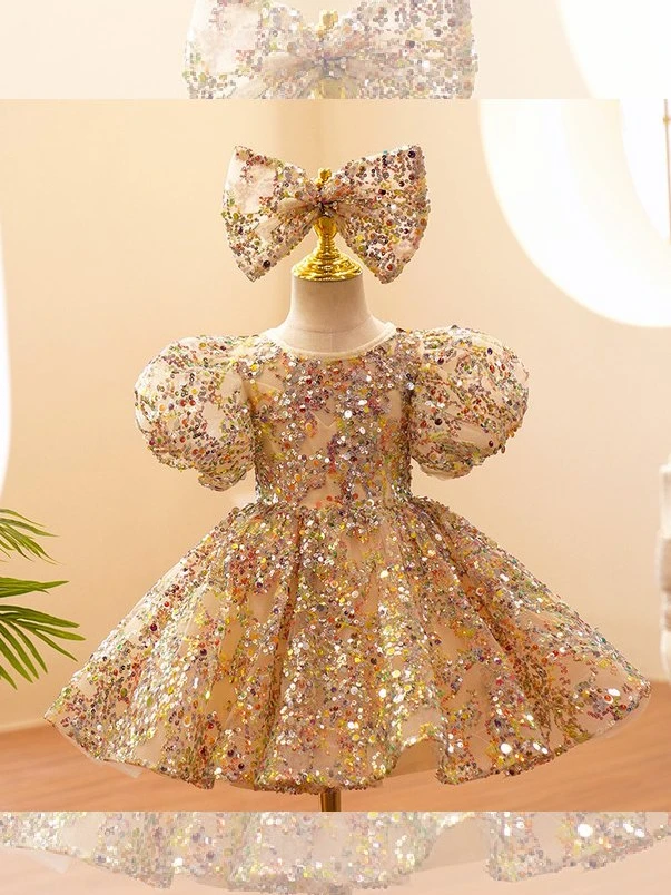 - Our high-quality puff sleeve mini dress comes straight out of your little girl’s fashion dreams! She’ll love being the center of attention with its golden sequin detailing!