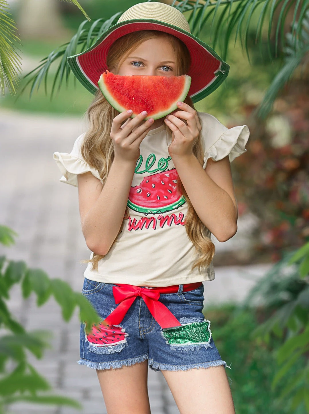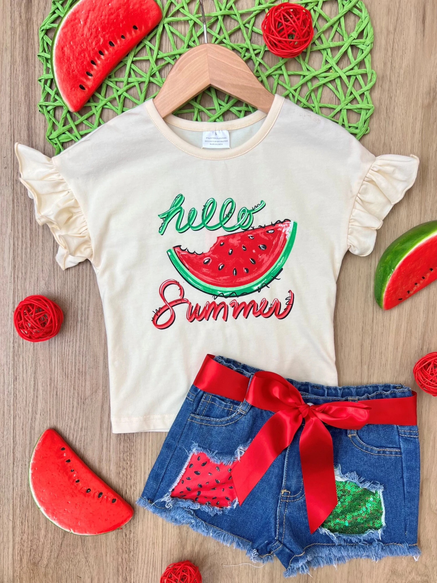 - “Hello Summer” ruffled short-sleeved watermelon graphic top and matching sequin patched denim shorts with a bow sash