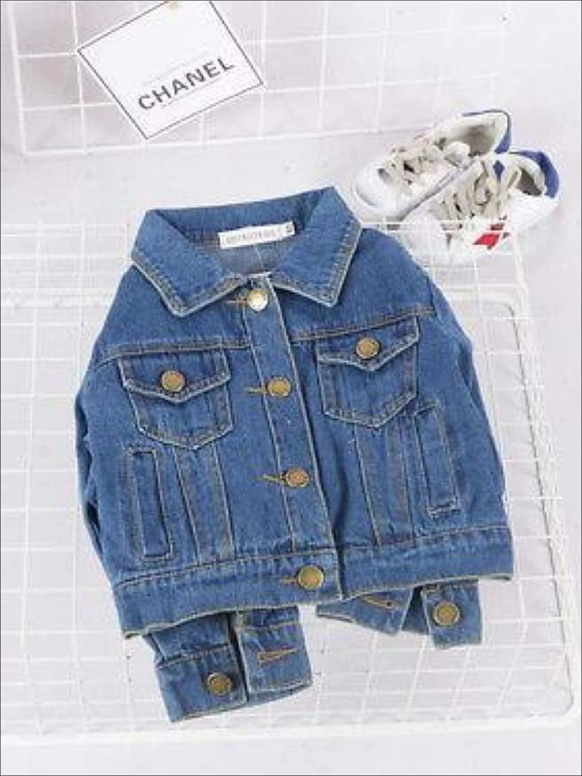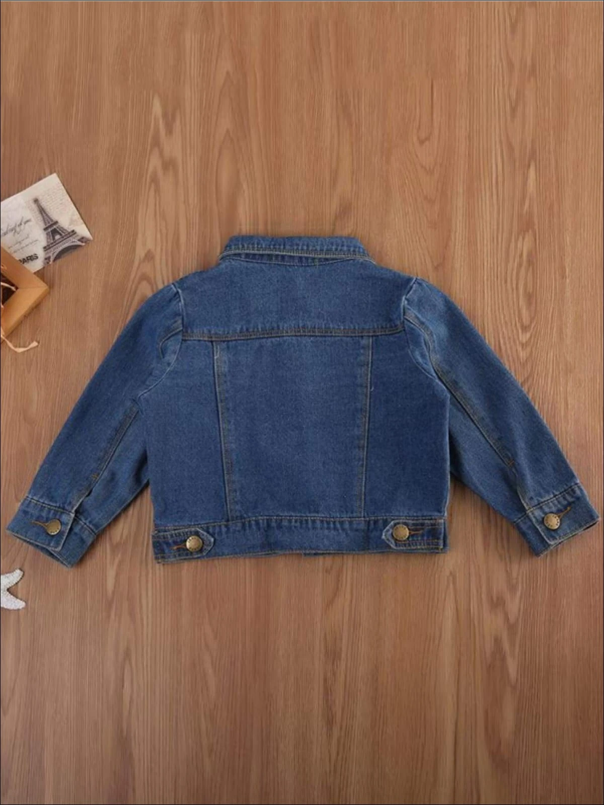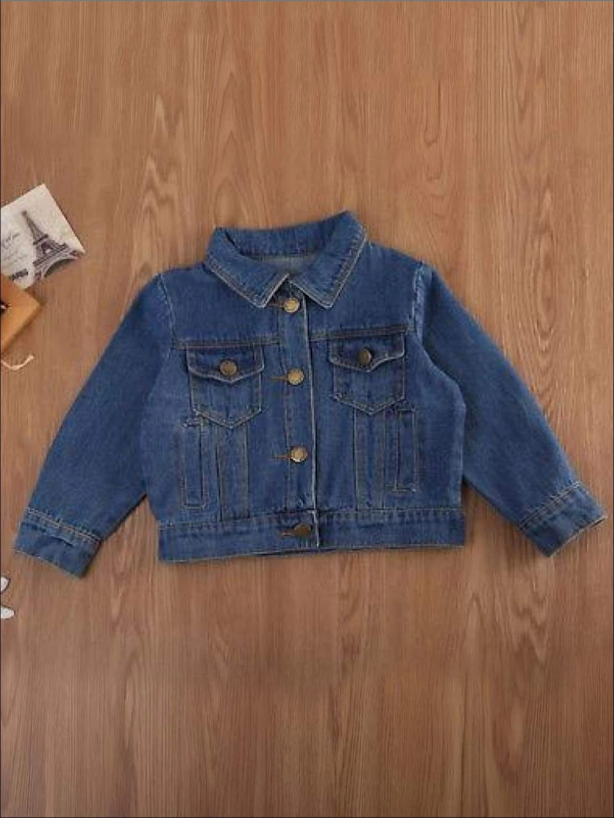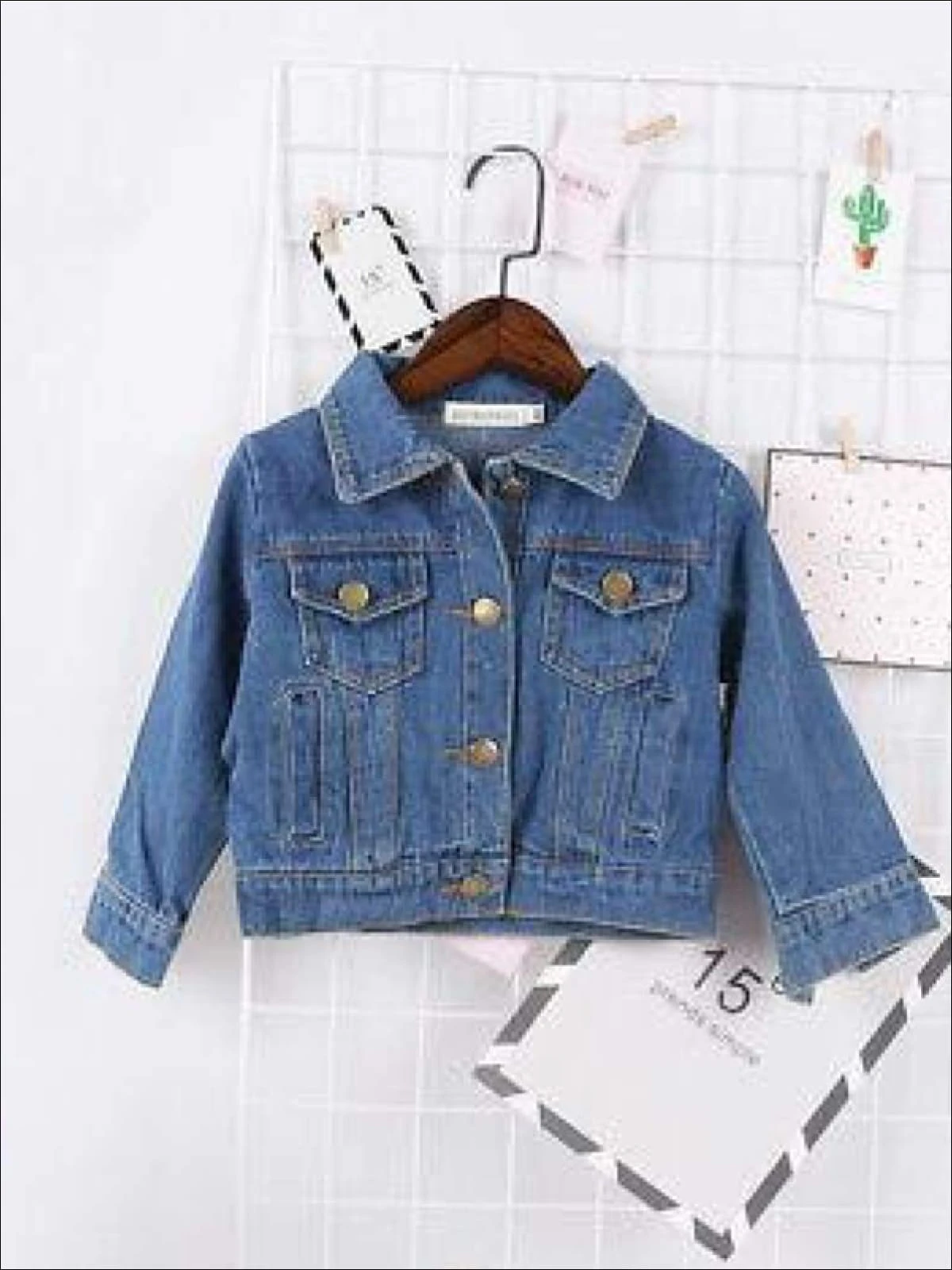 - Nothing makes an outfit cooler than a blue denim jacket! Make sure your little girl isn’t missing out, and grab her this simple yet sophisticated collared jacket.