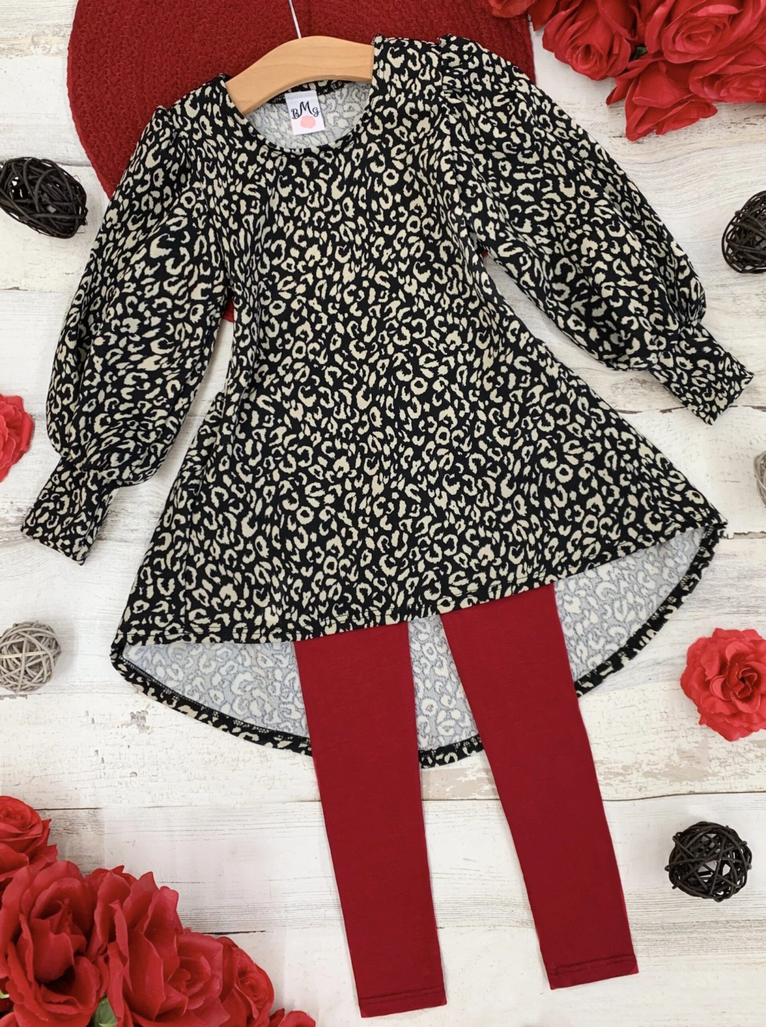 - Prep your girl for chilly days with the stylish comfort of our fierce leopard print set. She’ll be styled in a flash with this sweet ensemble that comes with a hi-lo tunic and leggings crafted from lightweight fabric.