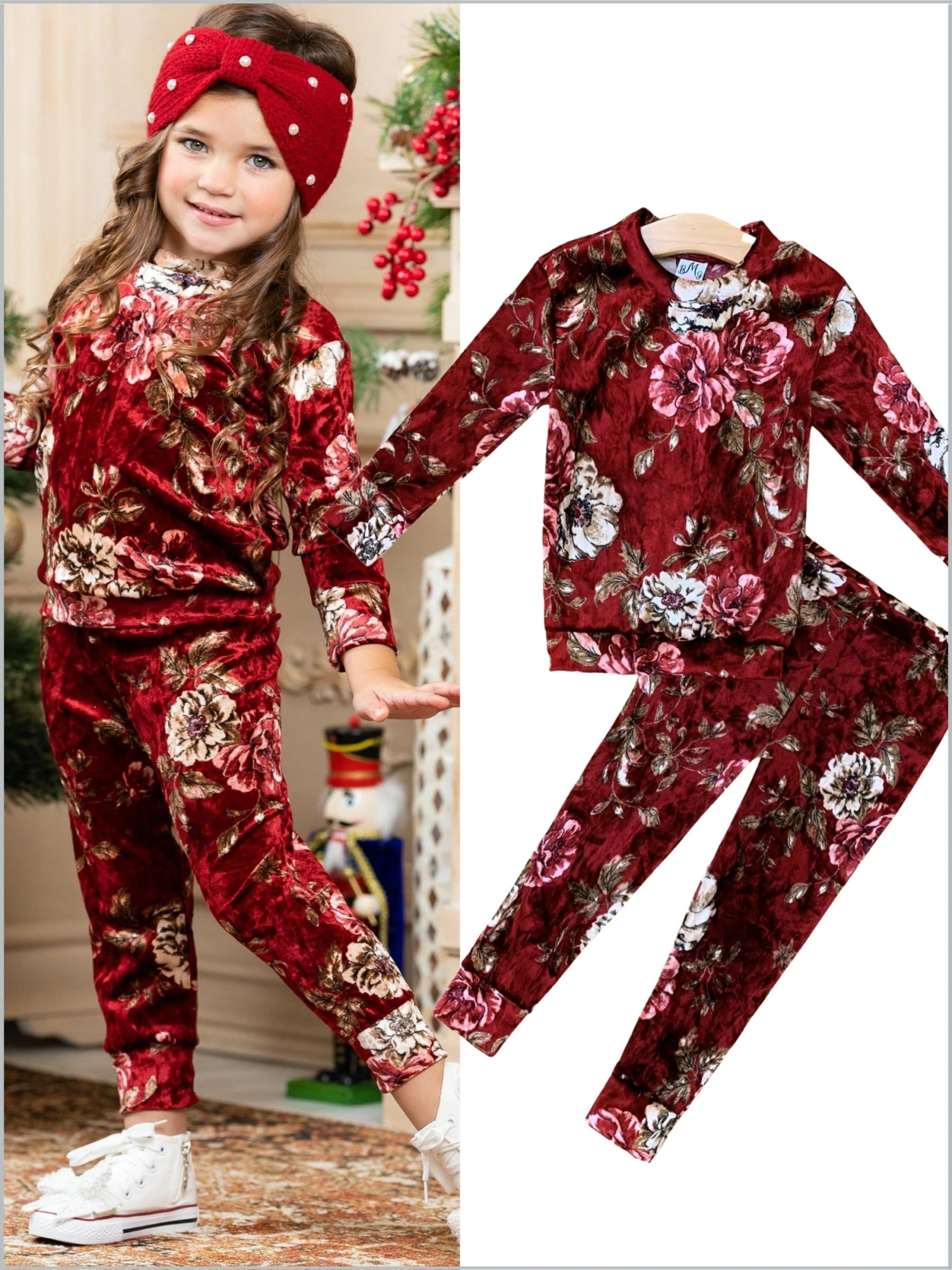 - Long-sleeve floral print crushed velvet sweatshirt and matching jogger pants