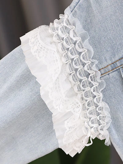 - Denim jacket with frilled lace accents, cuffed sleeves, and applique “LOVE” design