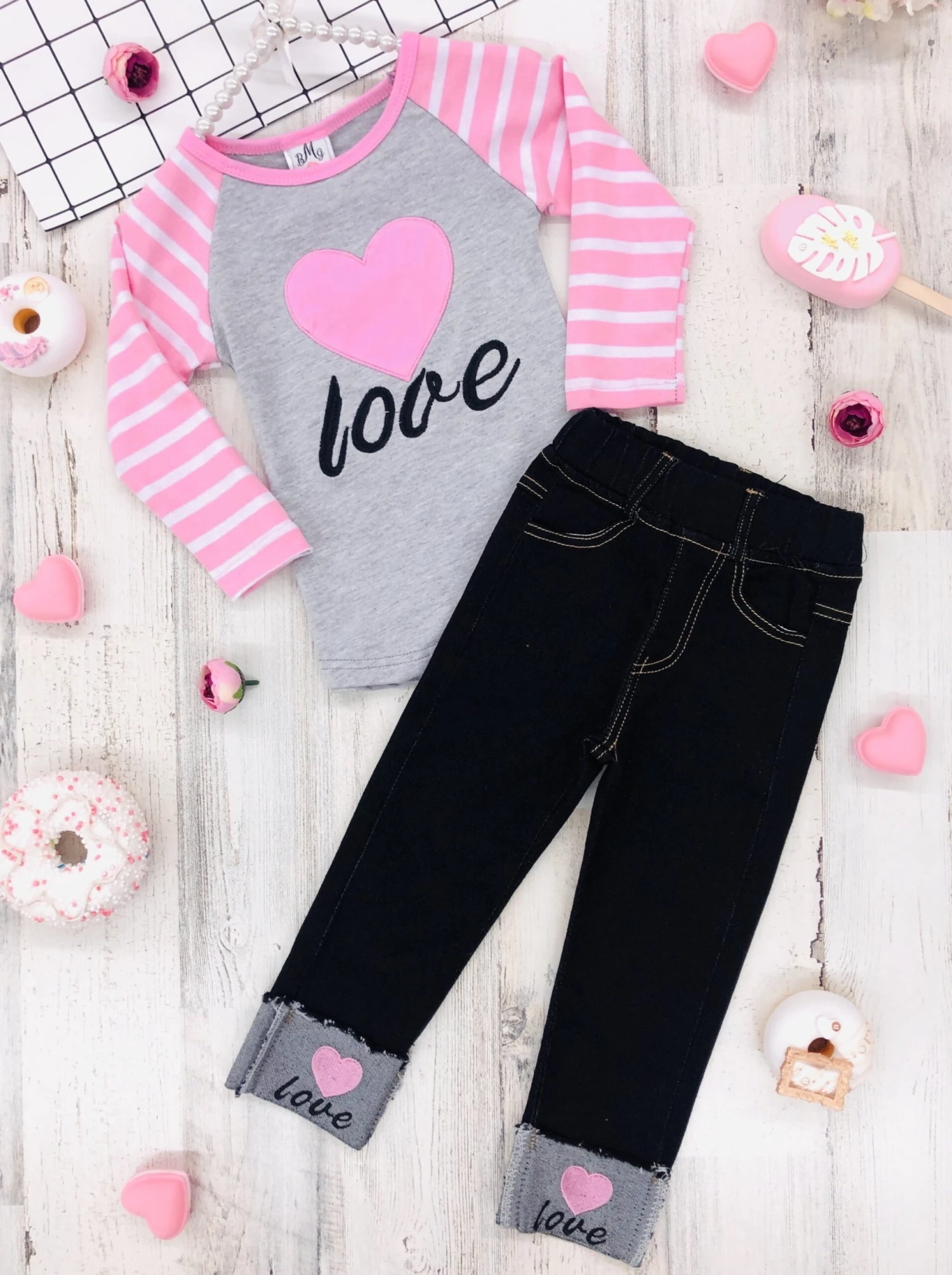 - The set features a raglan style top with long striped sleeves and a Love and Heart graphic, with black denim jeans with embroidered heart at the hem