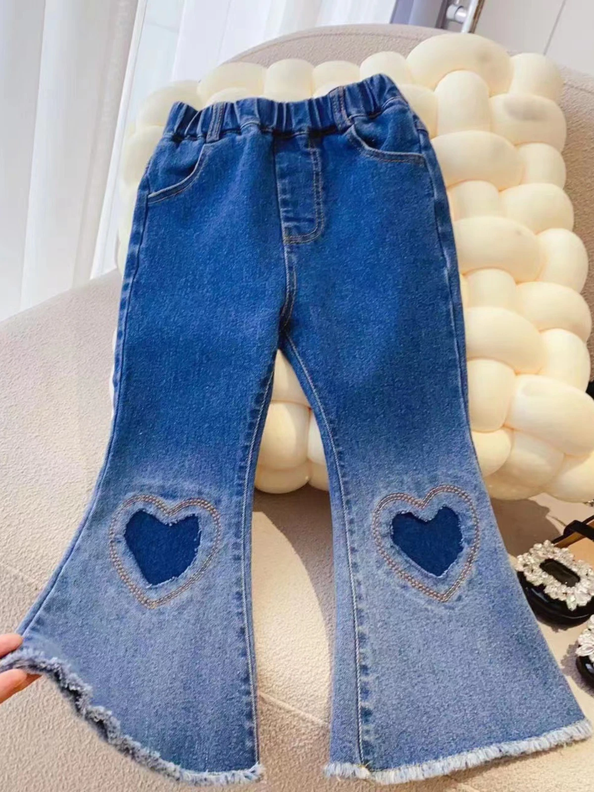 - Time to level up your little girl’s fall fashion! Our bottom frayed jeans serve trendy style with its heart patch detail and frayed hem. Makes any outfit look OOTD-ready!