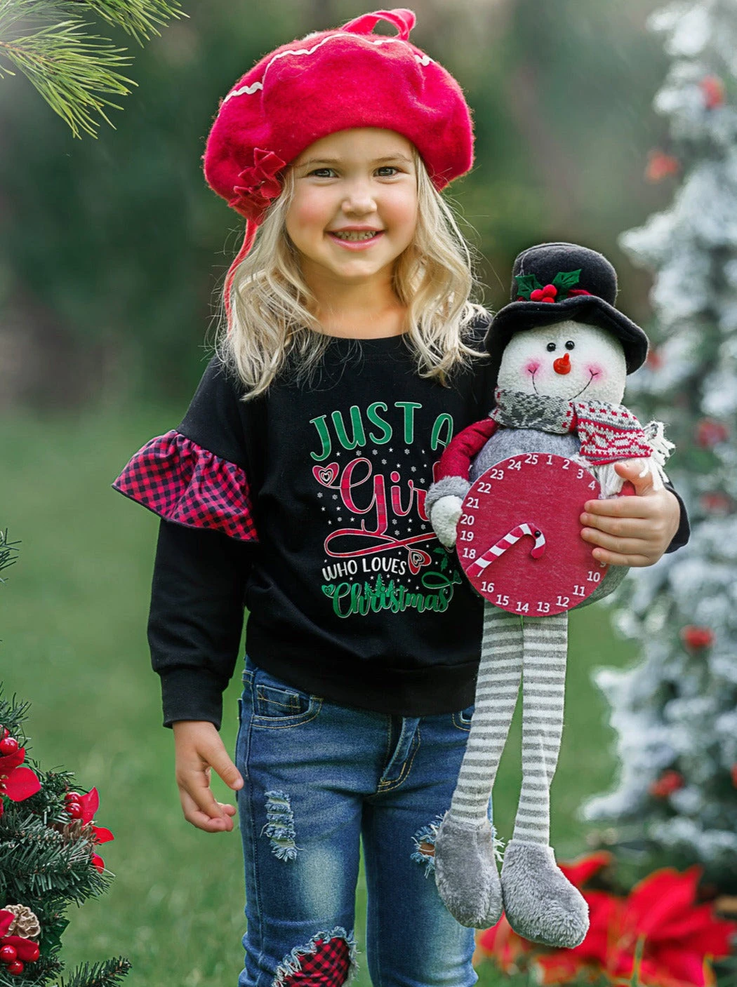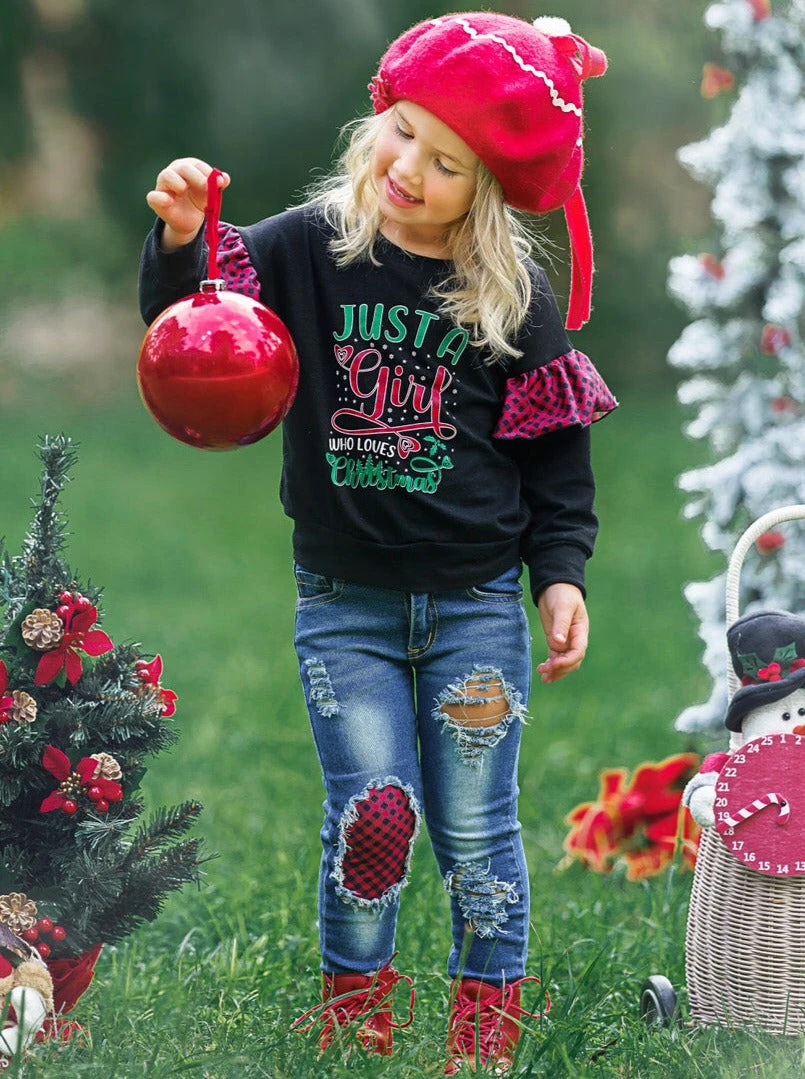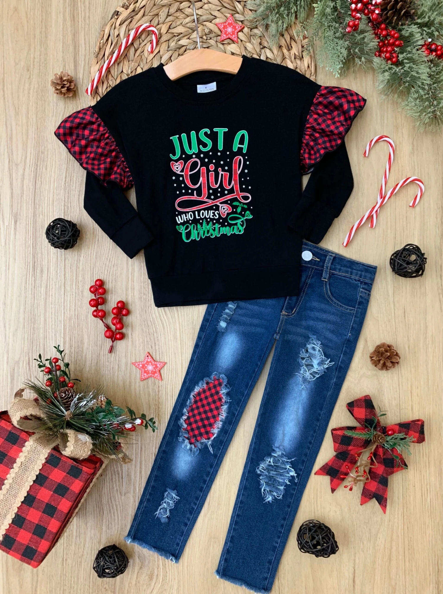 - Long-sleeve graphic sweatshirt with “Just a girl who loves Christmas” design, plaid shoulder ruffles, and matching patched distressed denim pants