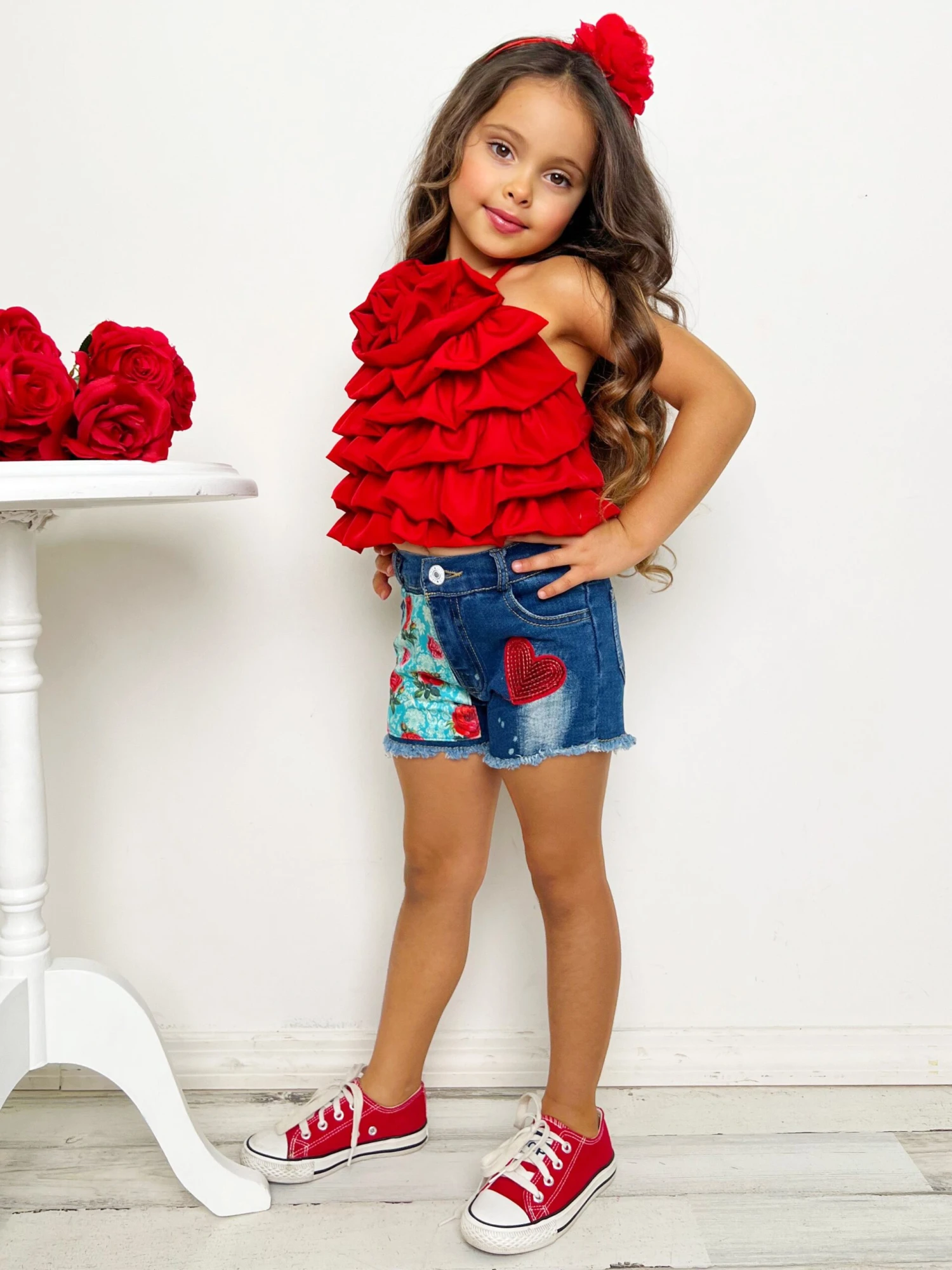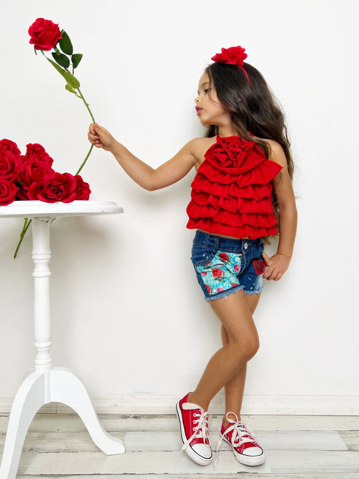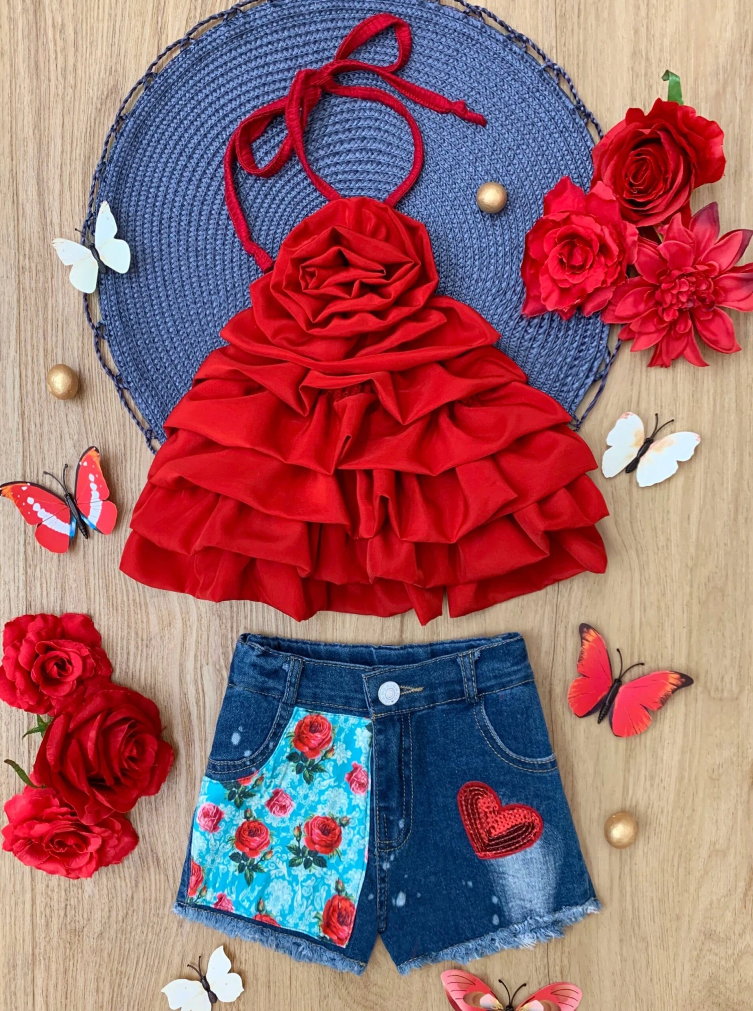 - Time for a spring wardrobe update for your most precious girl! Designed for mini fashionistas, this red rosette tiered top and denim floral shorts set is just the perfect pairing to make her stand out in style this season. She’ll be blooming like a beautiful flower!
