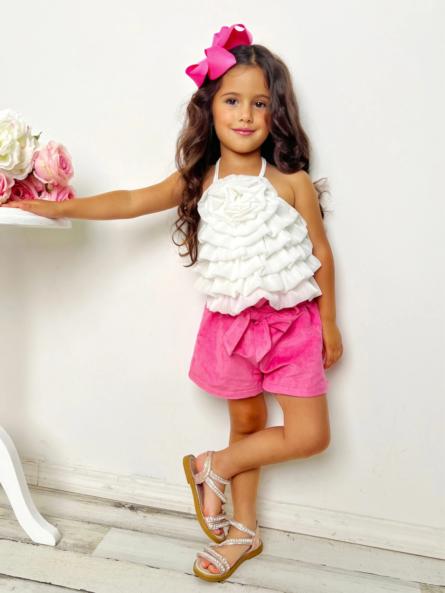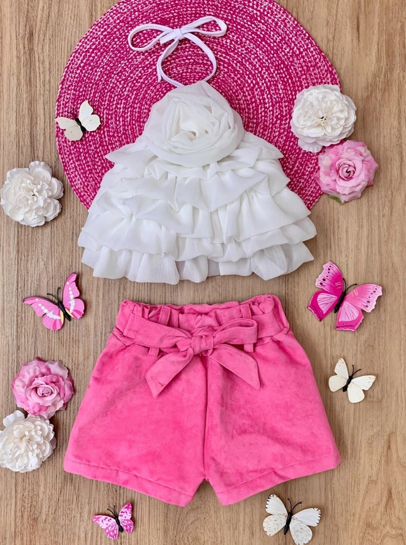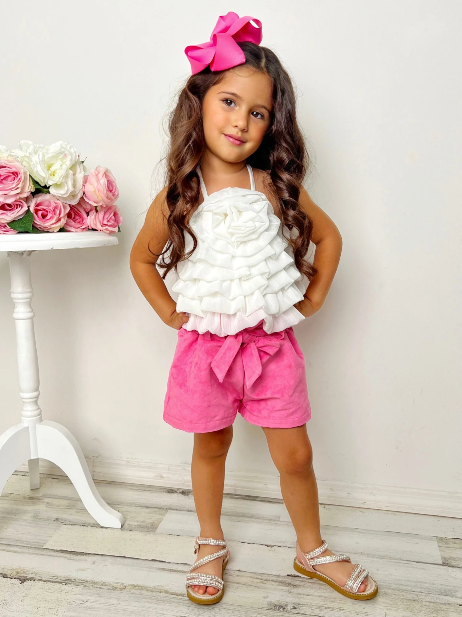 - Time for a spring wardrobe update for your most precious girl! Designed for mini fashionistas, this white rosette tiered top and denim floral shorts set is just the perfect pairing to make her stand out in style this season. She’ll be blooming like a beautiful flower!