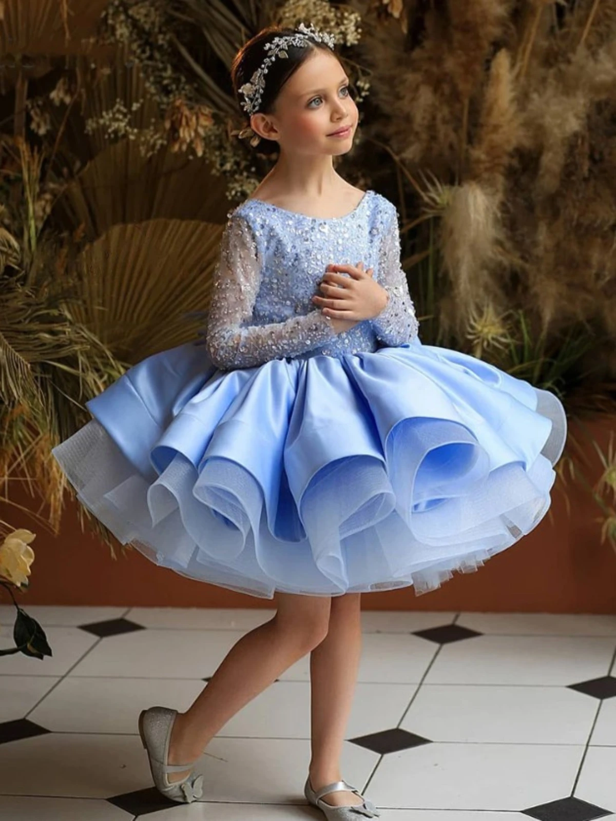 - Long-sleeve sequin tulle dress with layered skirt