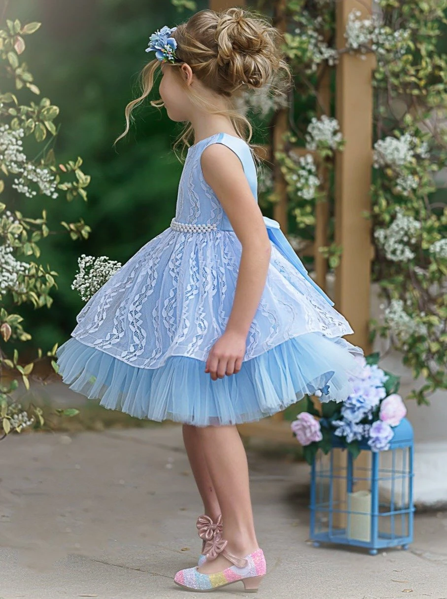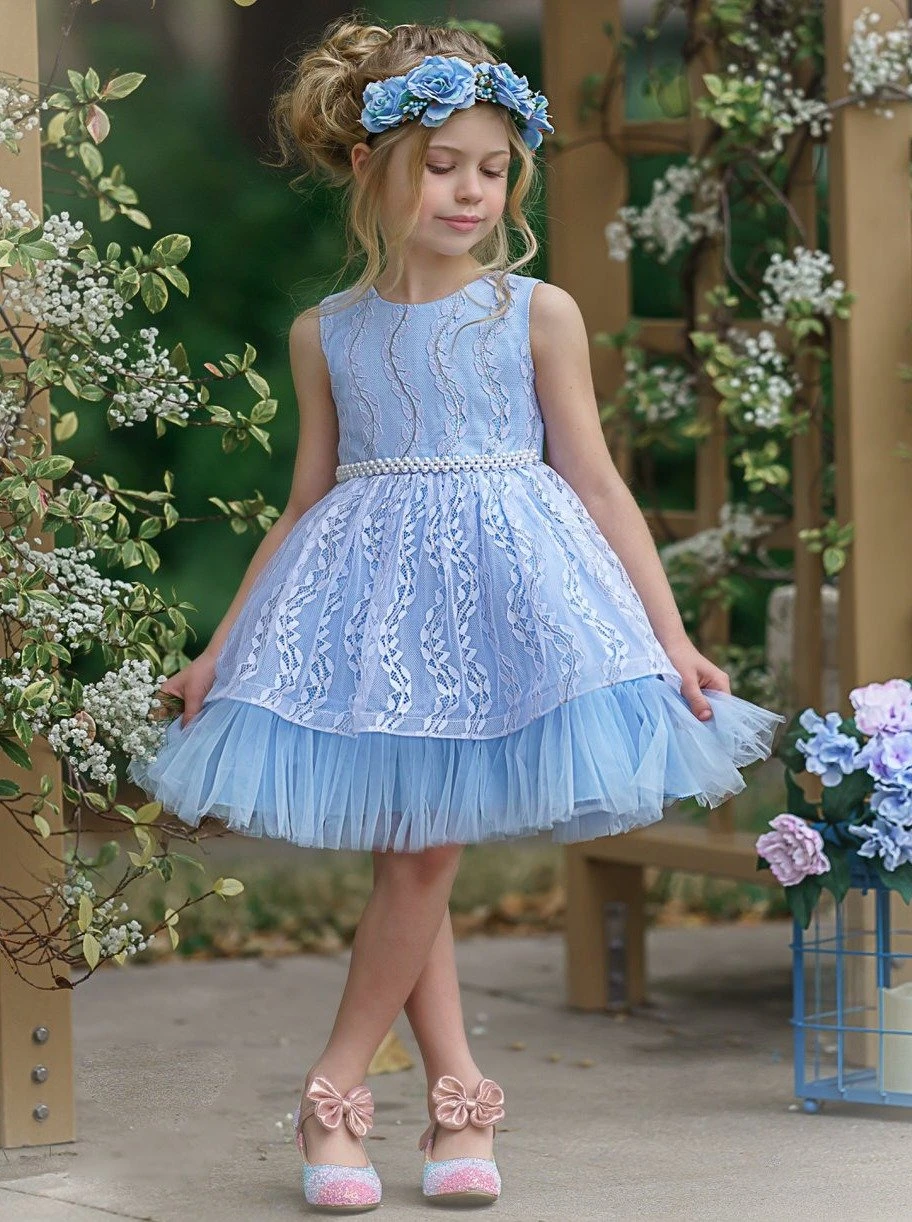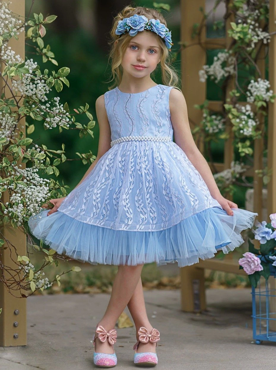 - This gorgeously embroidered lacey dress is your precious princess’s next favorite gown. Soft and delicate colors look stunning below the unique, wavy lace design. And the pearl inlaid waistline is divine! There’s even a sweet bow tied in the back! Such a sophisticated formal dress for your little girl to fall in love with!