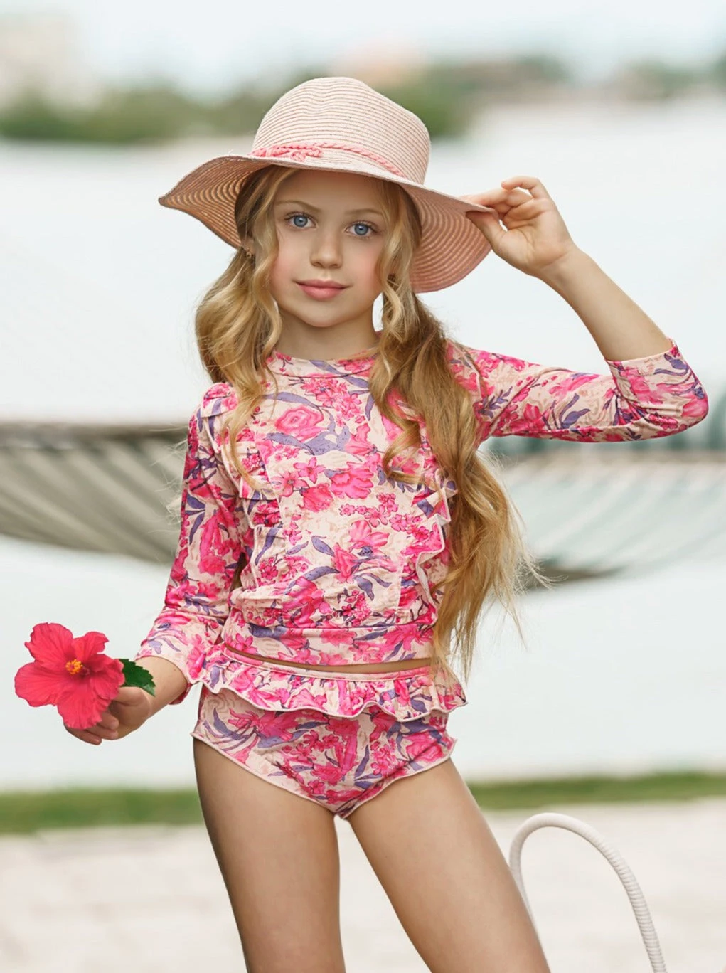 - Two-piece rash guard swimsuit features long sleeve top and ruffled bottoms
