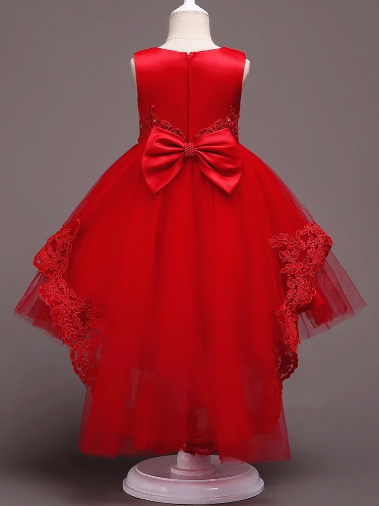 - Sleeveless princess dress with lace embroidered bodice and peplum hi-lo skirt and layered tulle underskirt with back bow finish; back zipper