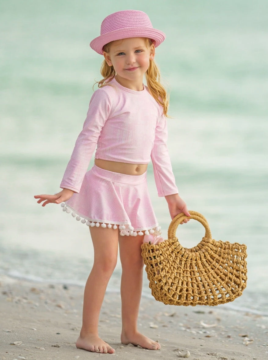 - Keep it cute, even when swimming in our skort two-piece swimsuit. Long sleeves give added protection from the sun, and the skirted bottoms make it fun to twirl, spin, and splash among the waves!