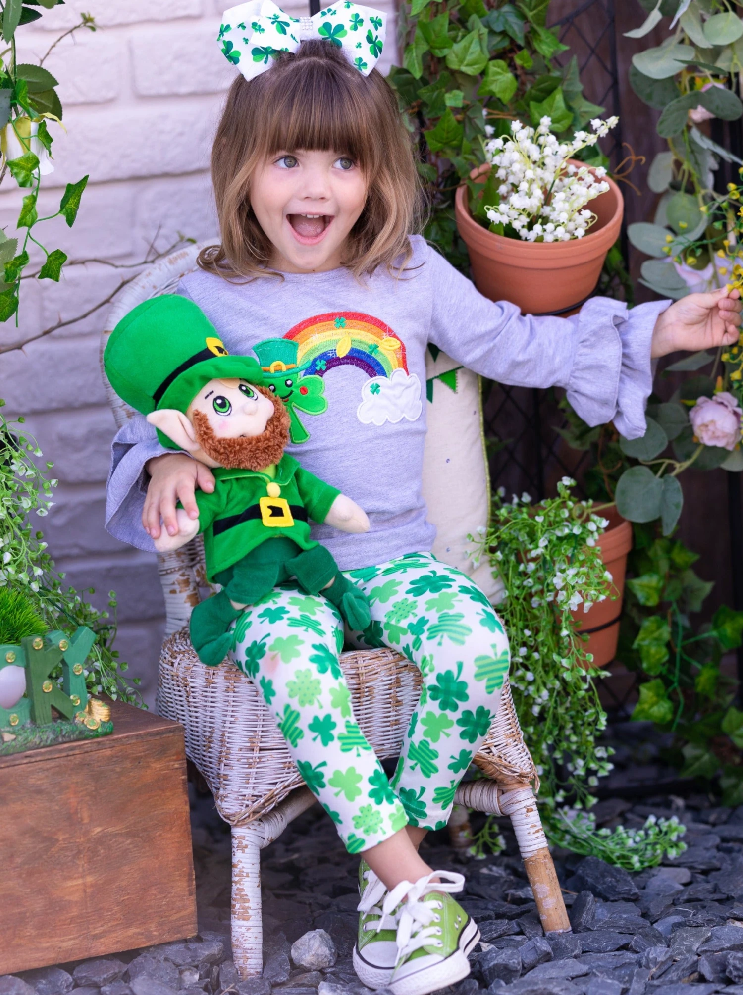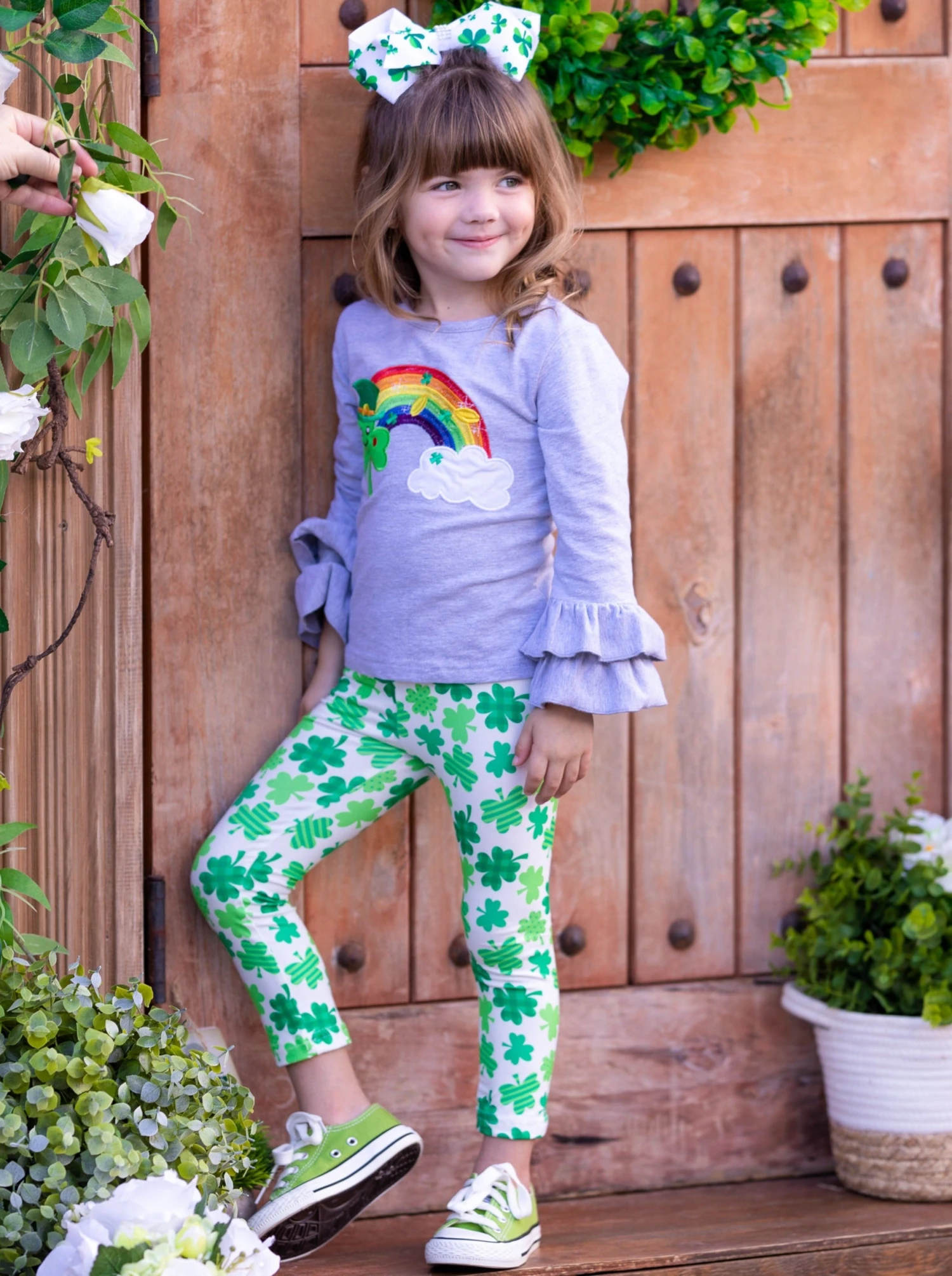 - Clovers, gold, and rainbows! What more could a sweet fashionista ask for in her St. Patrick’s Day outfit? Soft to the touch, stretchy for all-day play, and covered in clovers, this ruffle cuff graphic top and all-over print leggings are as cute as can be for your lovely lass to wear to school, parties and parades.