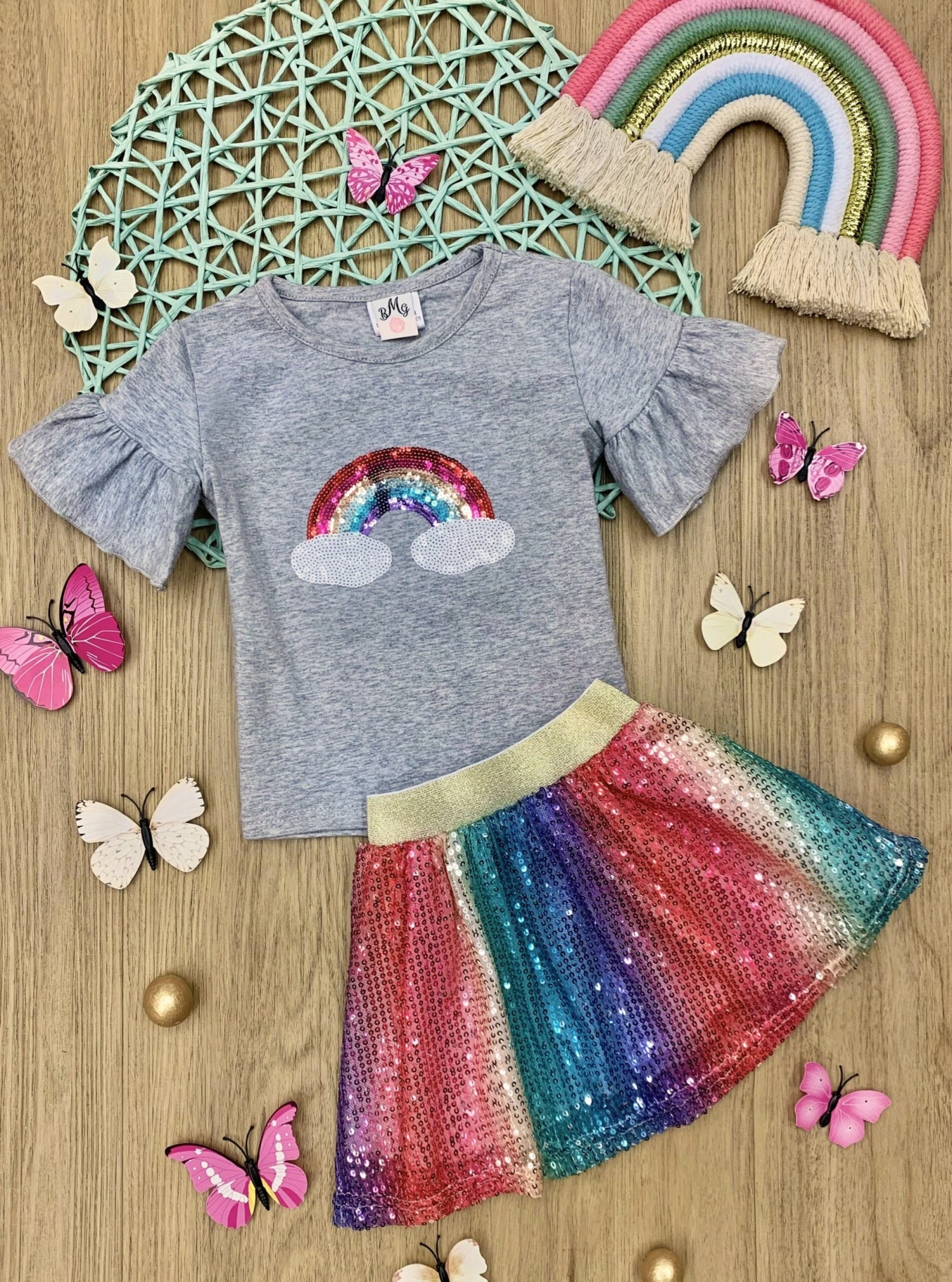 - The set features a grey top with short ruffled sleeves with sequin rainbow and clouds applique and a rainbow sequin skirt with a gold waistband