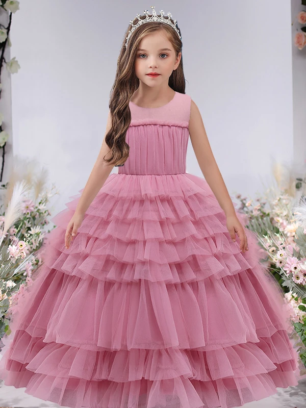 - Sleeveless princess dress with sheer collar, ruched bodice, and tiered mesh full-length skirt with tulle overlay; back zipper
