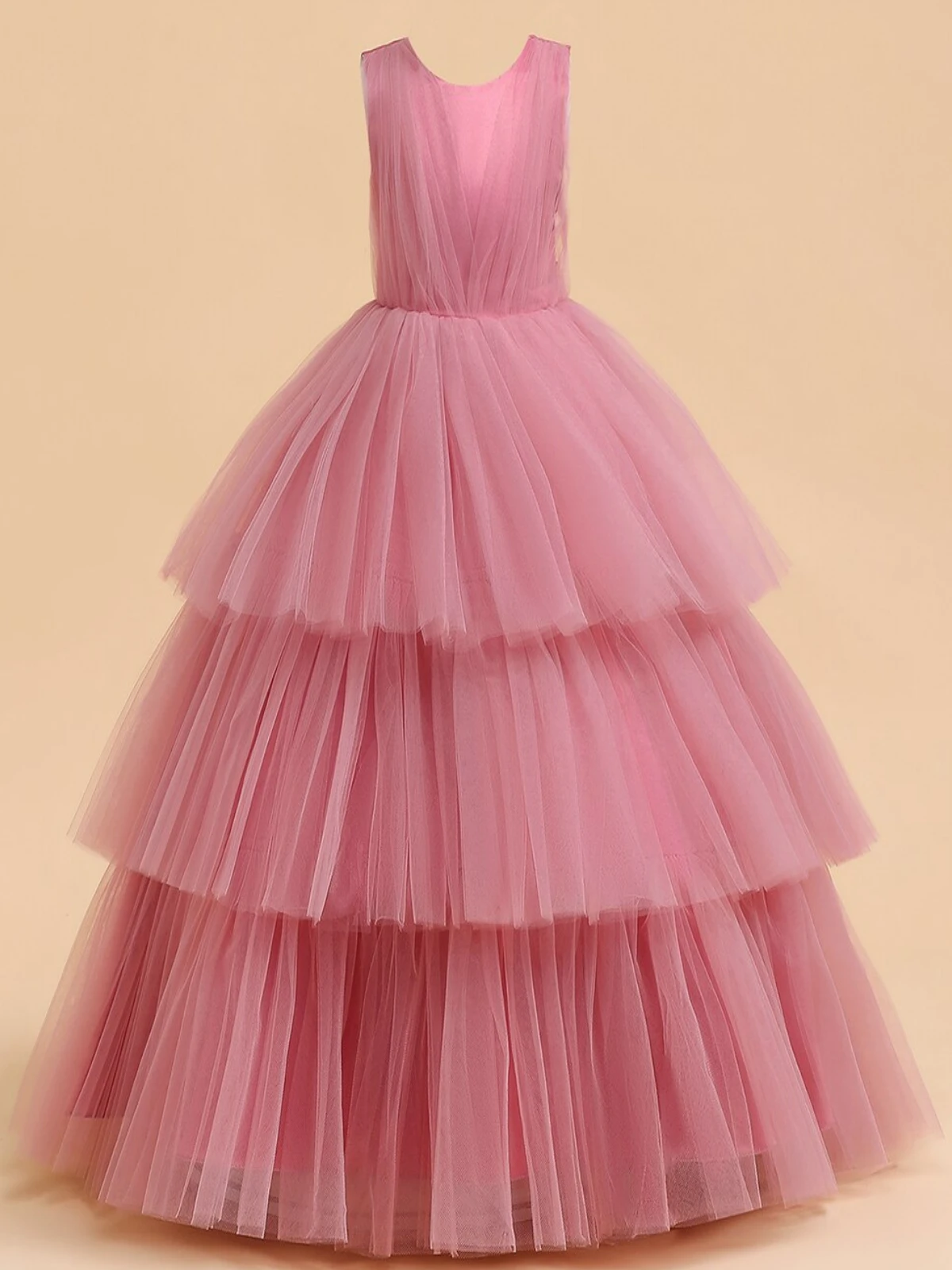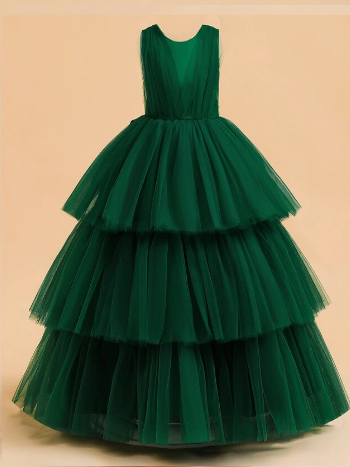 - Sleeveless tiered cascading tulle gown with satin bow at the back