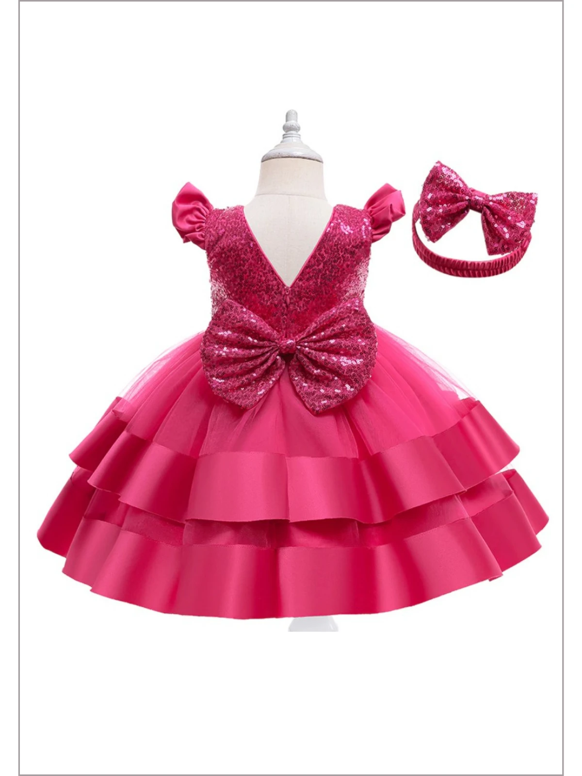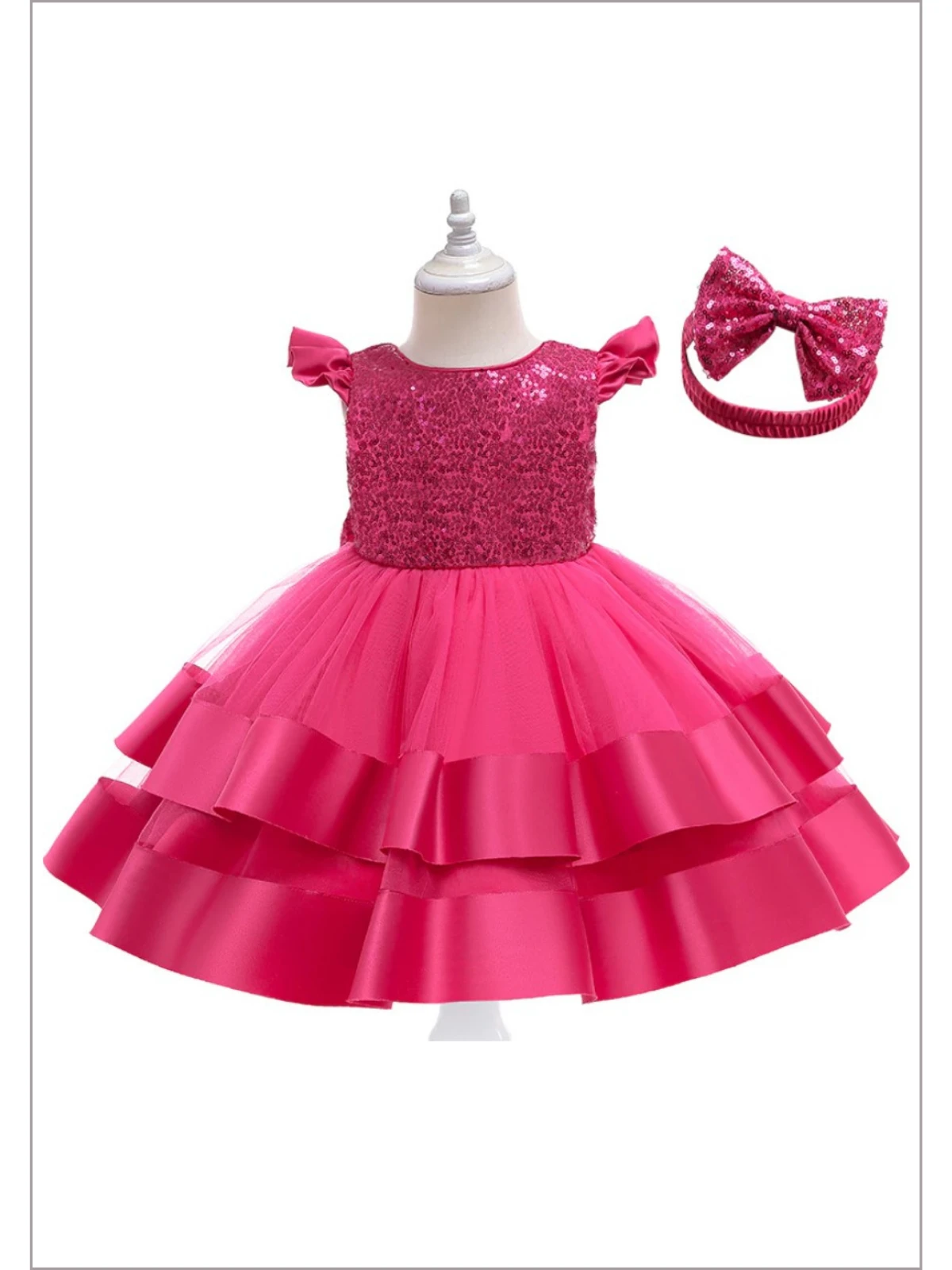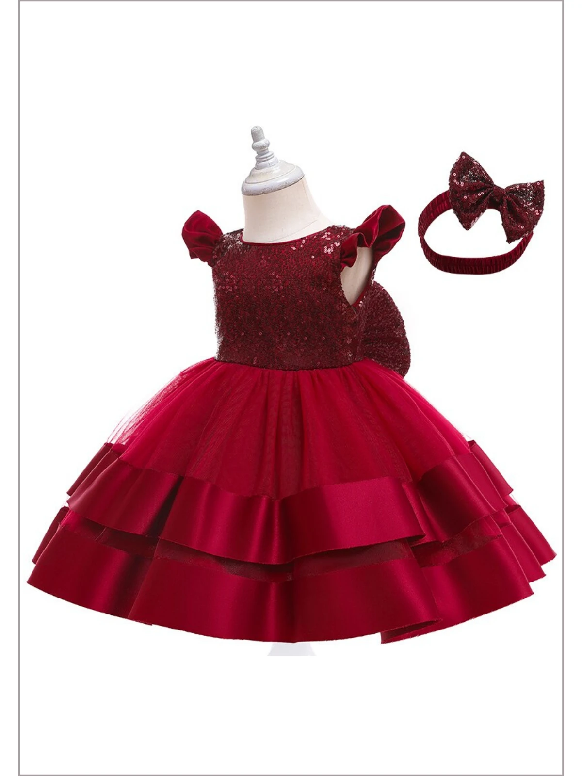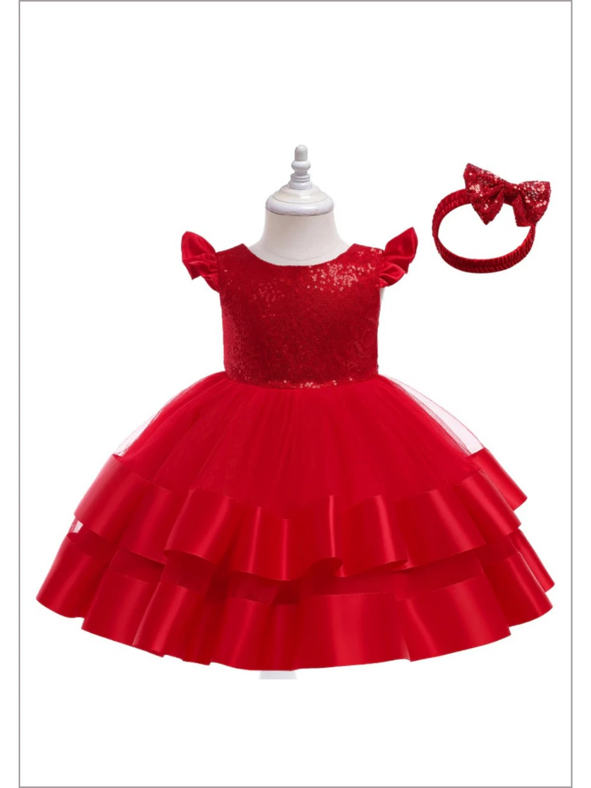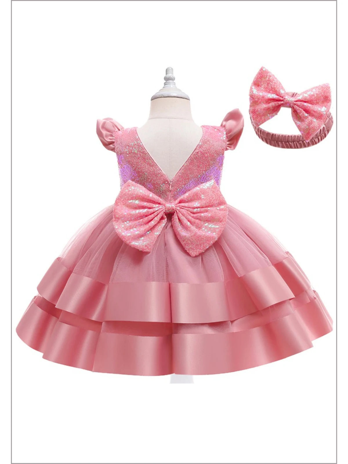 - Flutter sleeve sequin dress with layered skirt and statement bow accent; matching sequin headband