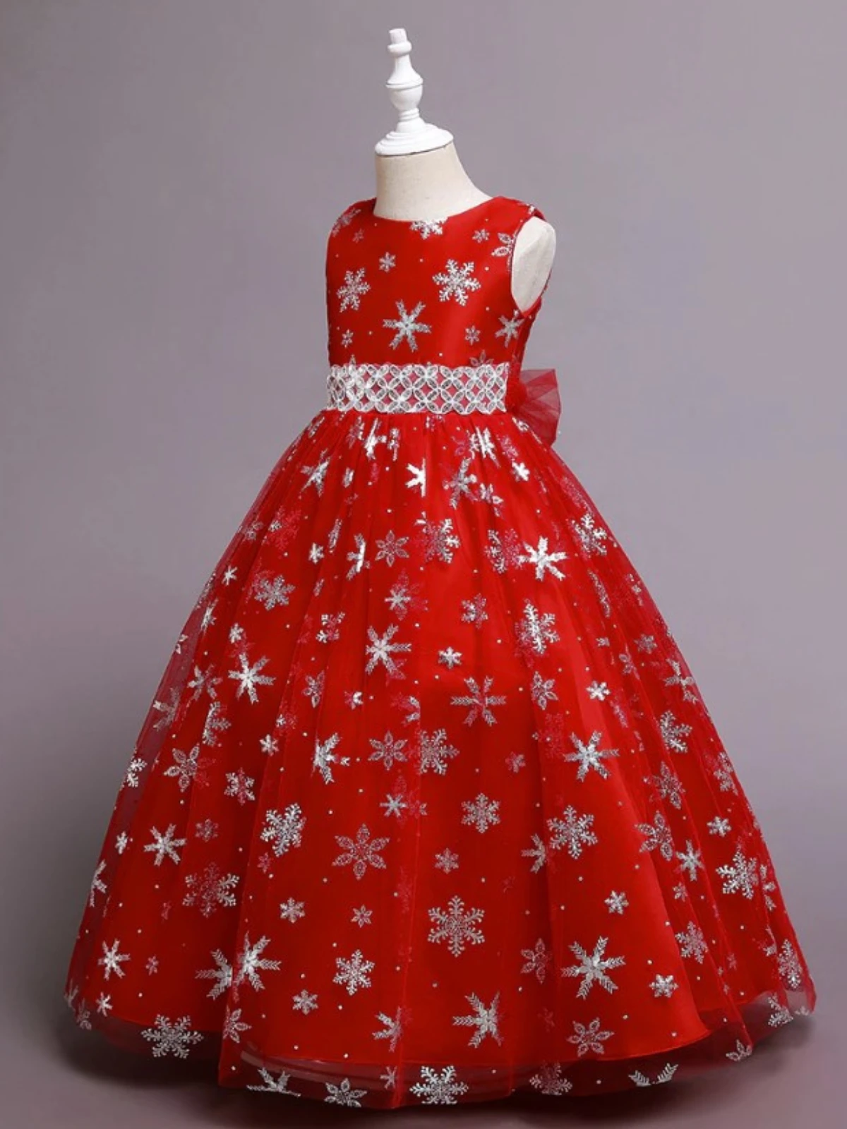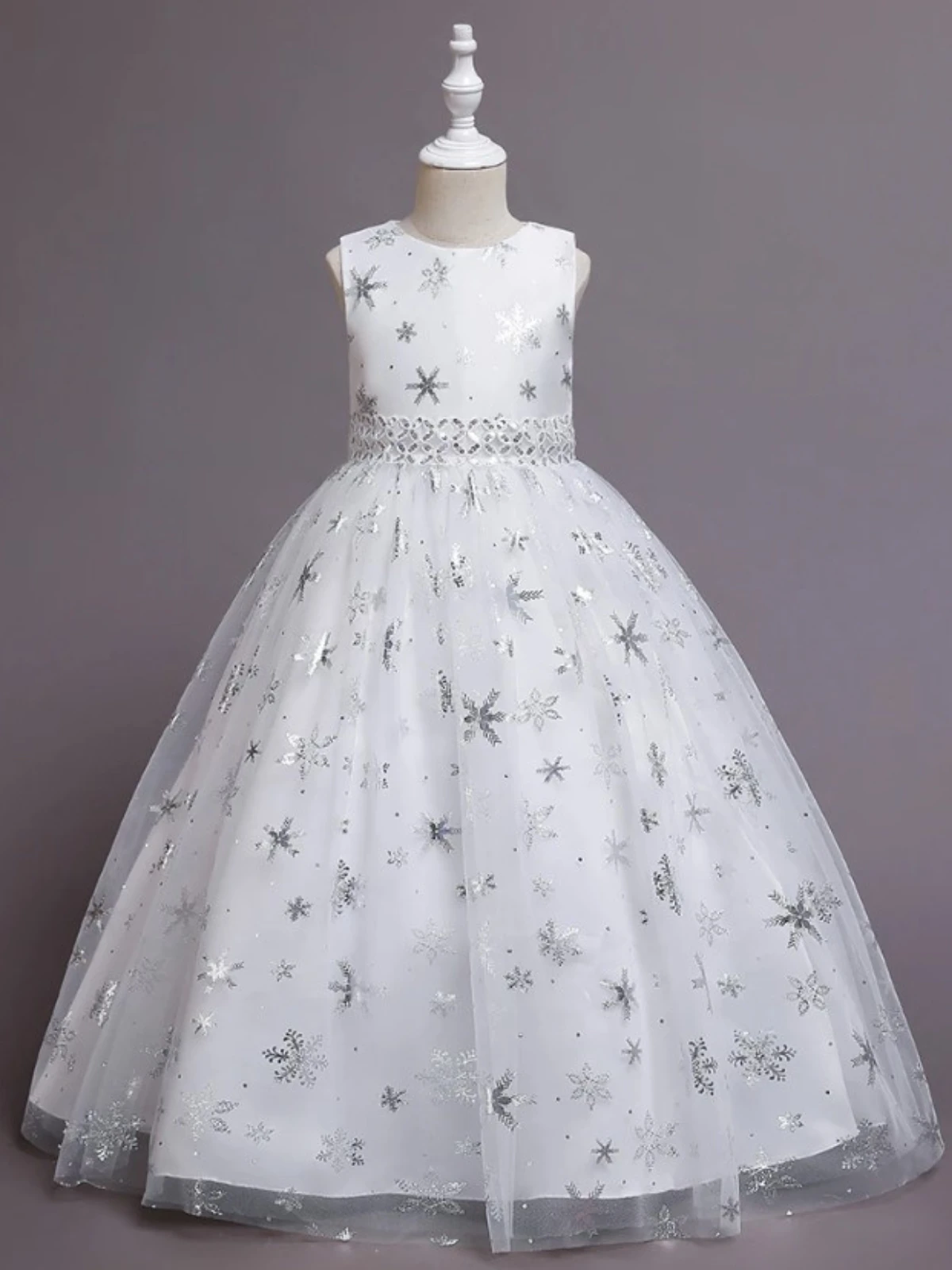 - Sleeveless tulle long gown with snowflake print and waist detail