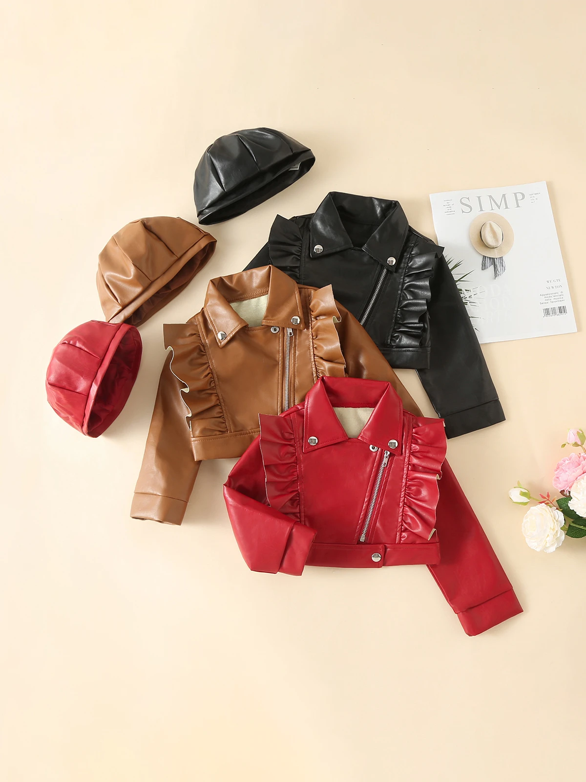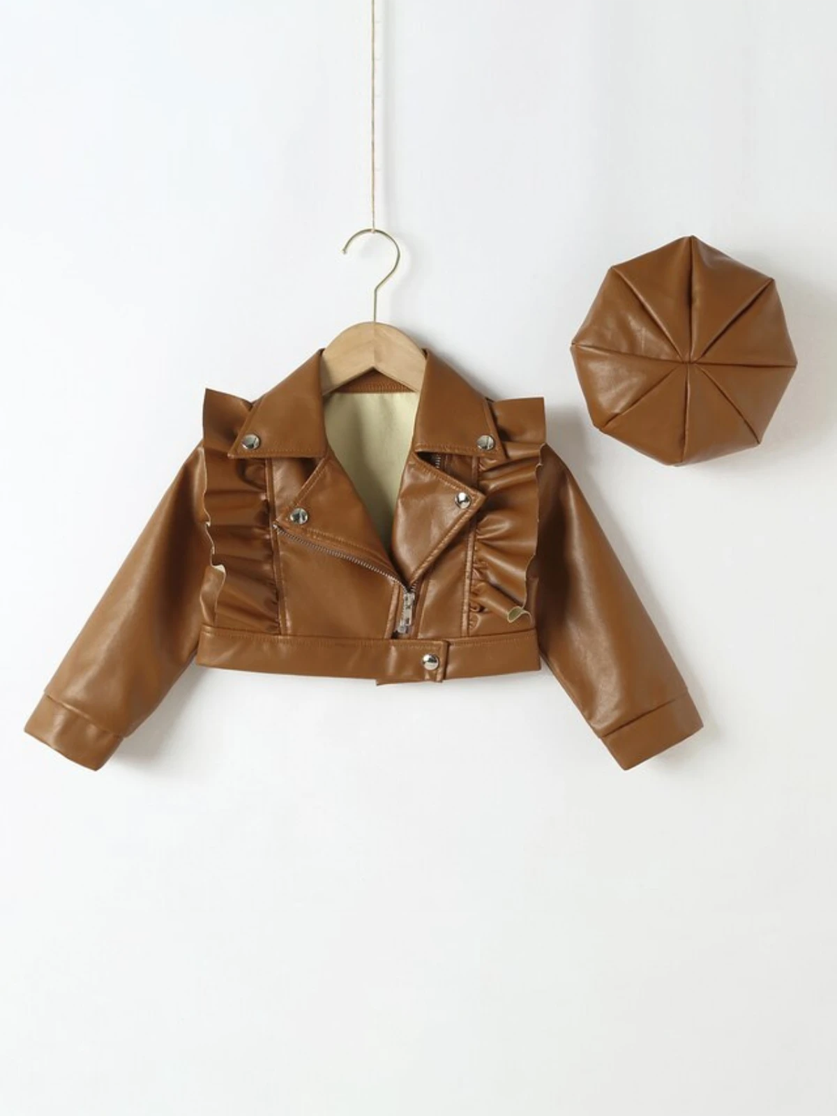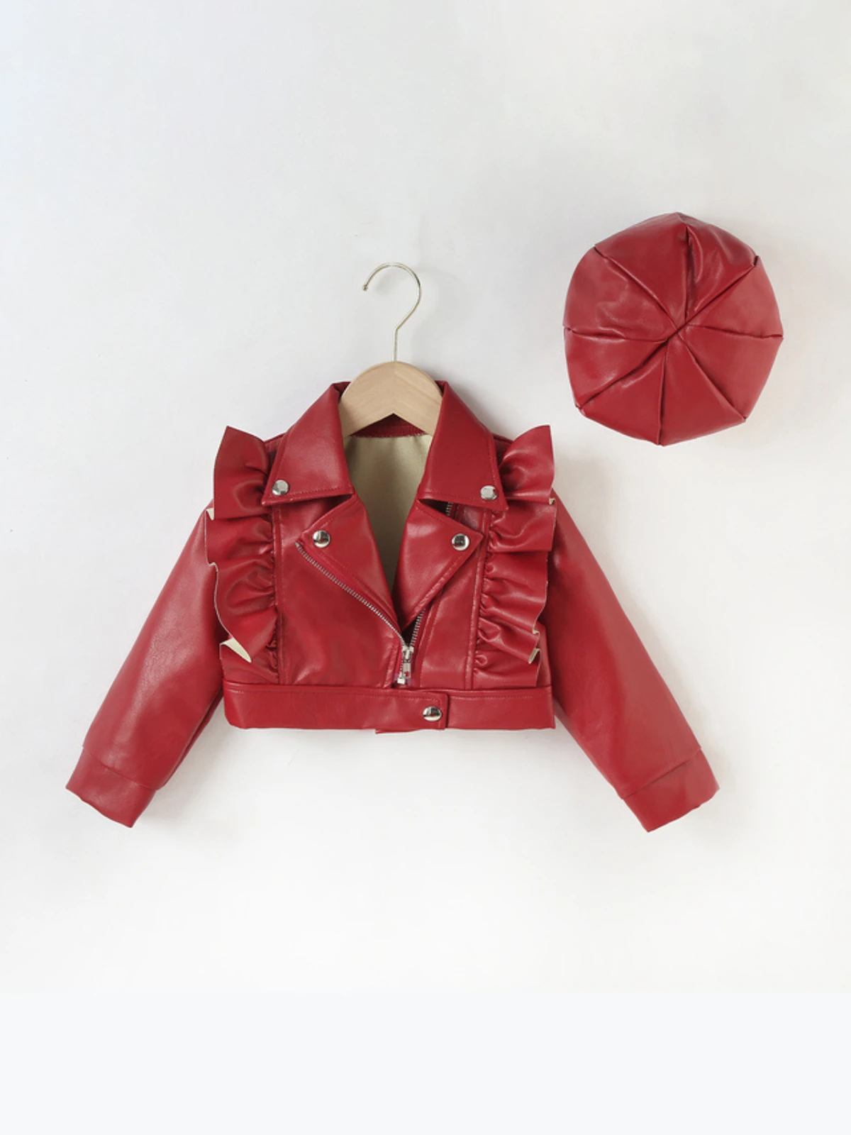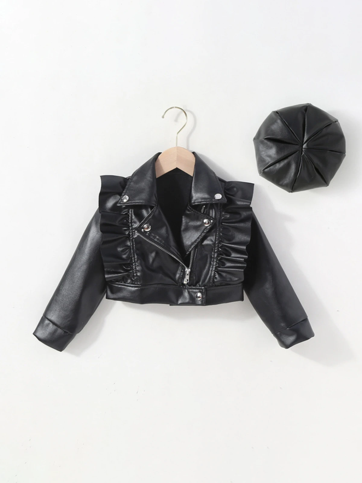 - PU leather cropped jacket with ruffle and zipper details and matching beret hat