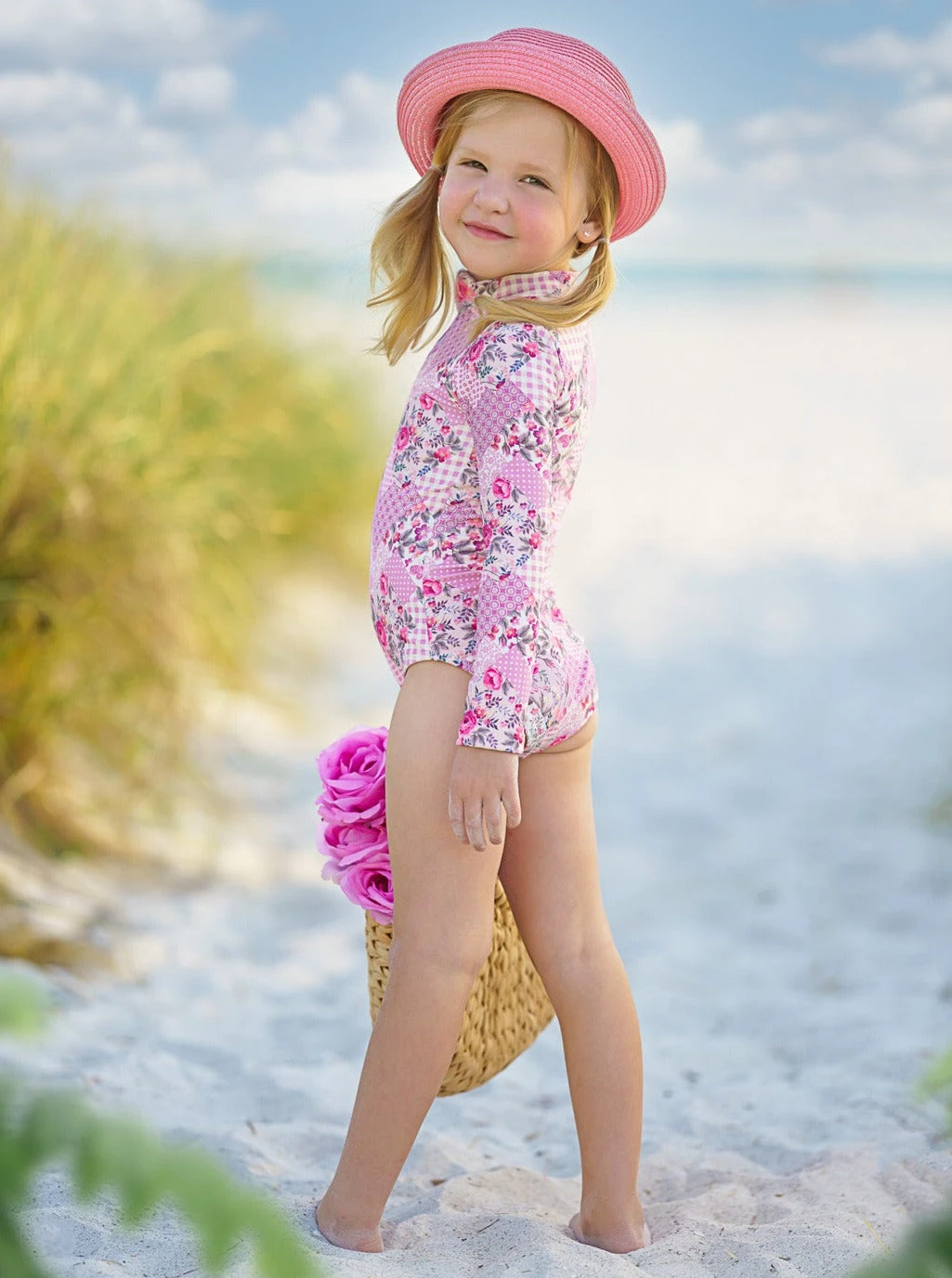 - Let’s hit the beach wearing this precious patchwork rash guard swimsuit. This sleek one-piece is keeps its cuteness in and out of the water with long sleeves and a high-neck for added protection as she swims and plays.