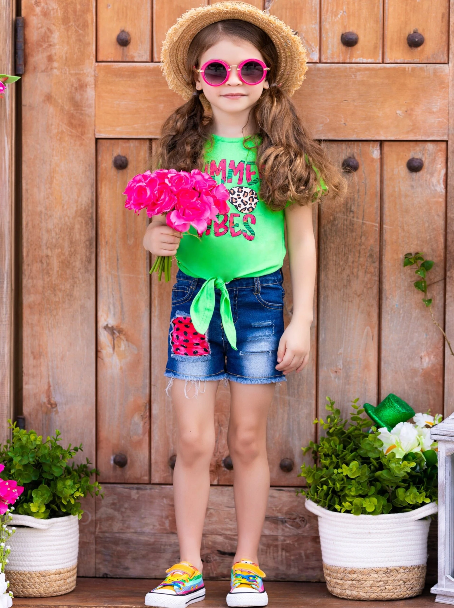 - Cute tops and patch denim shorts are here to give your little girl the Summer vibes she’s been missing! Such a cool graphic tee! The watermelon cuteness continues in the shorts; perfect for all-day Summer play!