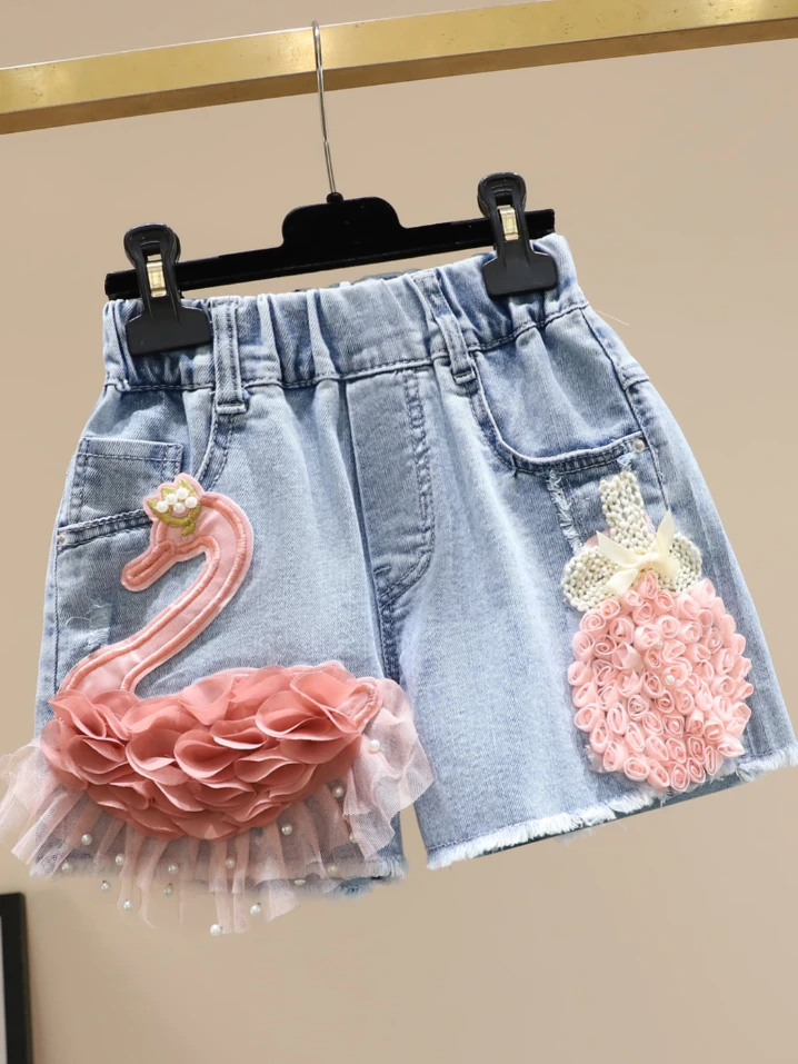 - These denim shorts are so adorable that you can’t help but swoon. It has a swan applique and fuctional pockets. It looks amazing with a cut tank top and casual sandals. Perfect for warm days outside!