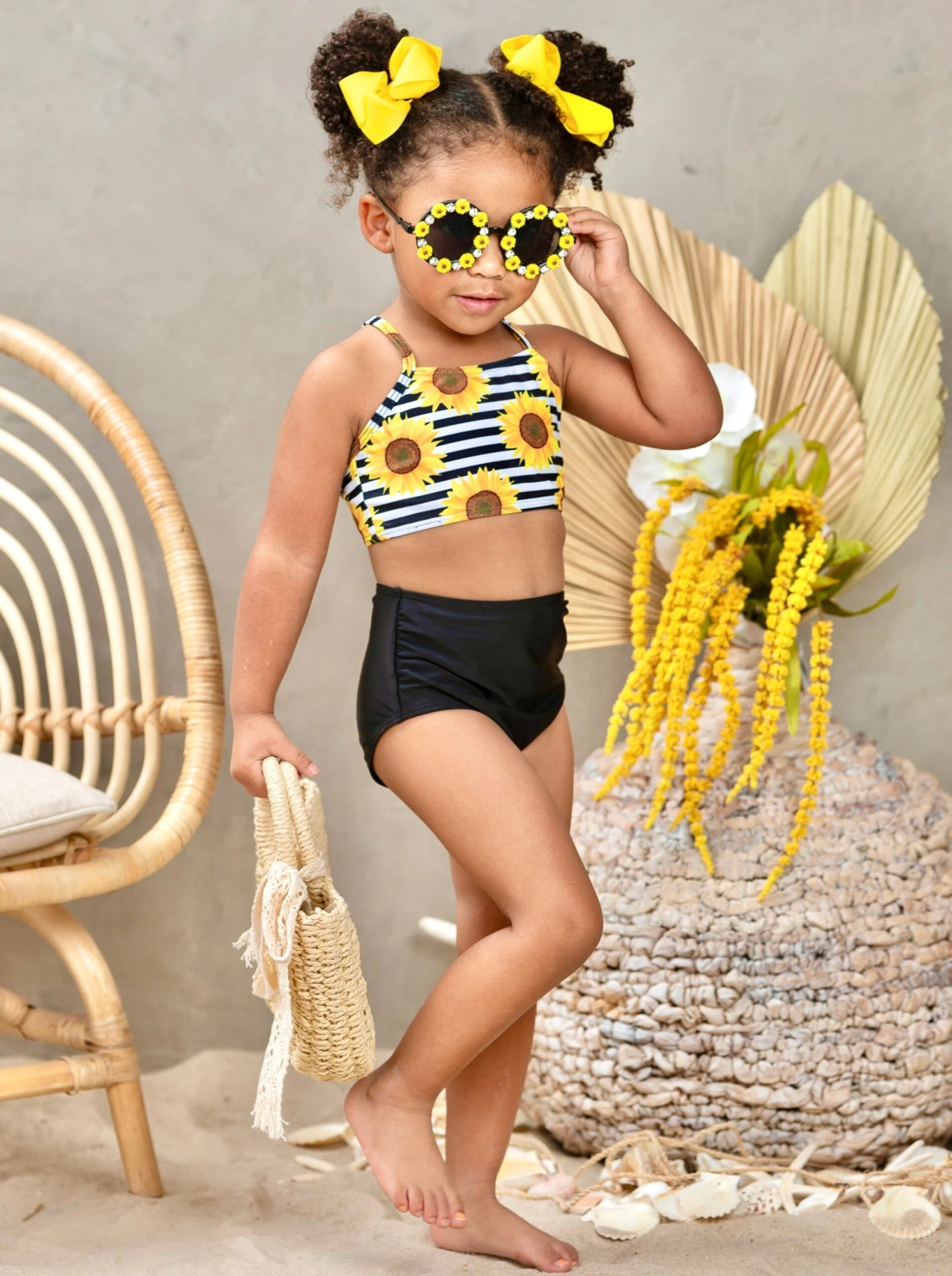 - Talk to the sand and soak up the sun in a super-cute high-waisted tankini! The flattering sunflower and chic stripe design are paired with the solid black bottoms to create a trendy toddler and big girl look.