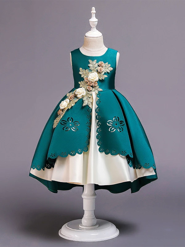 - Sleeveless princess dress with layered peplum hi-lo pleated skirt, floral applique bodice, and bow in back