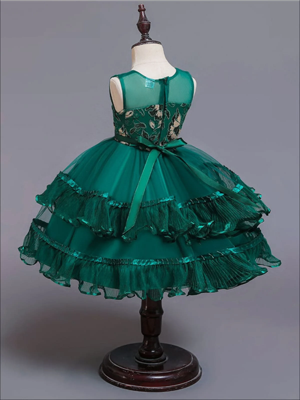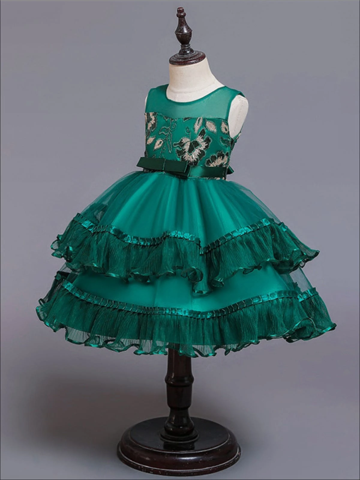 - Sleeveless tiered princess dress with sequin embroidered chiffon bodice, bowed waistline, and layered ruffle tulle skirt with satin trim; back zipper